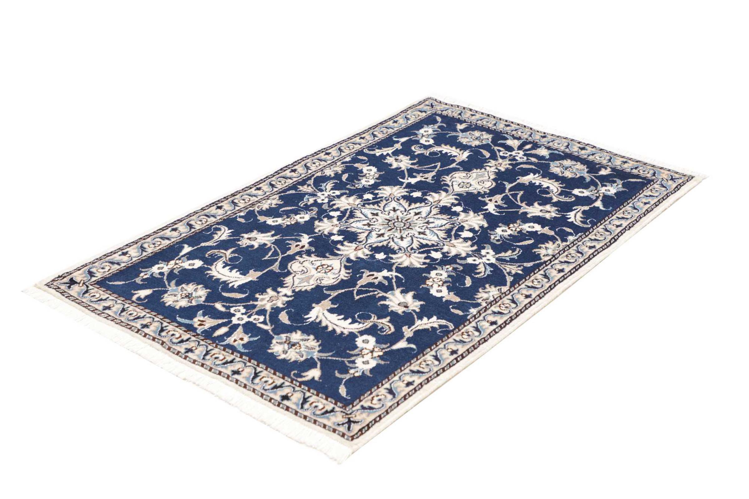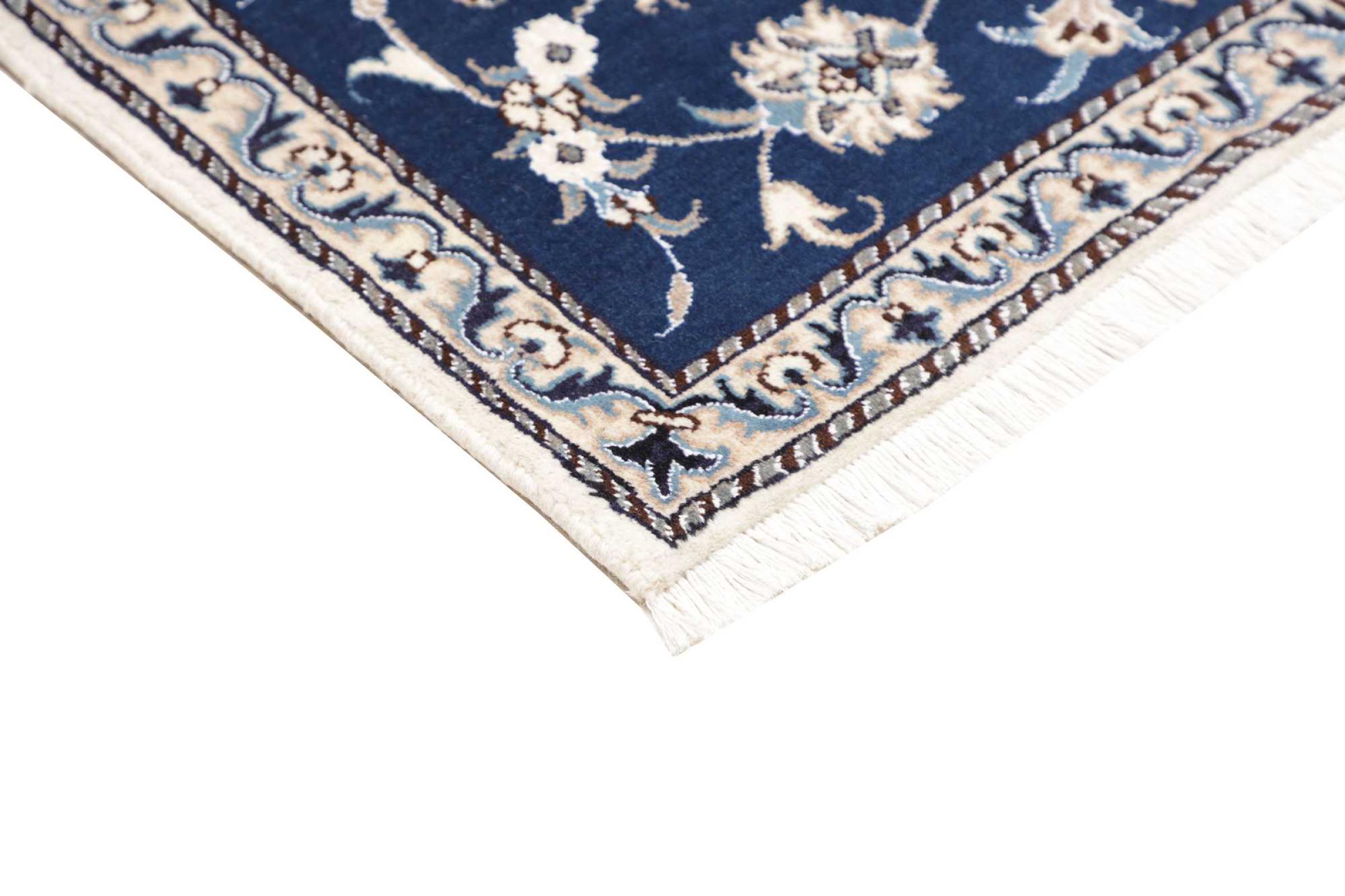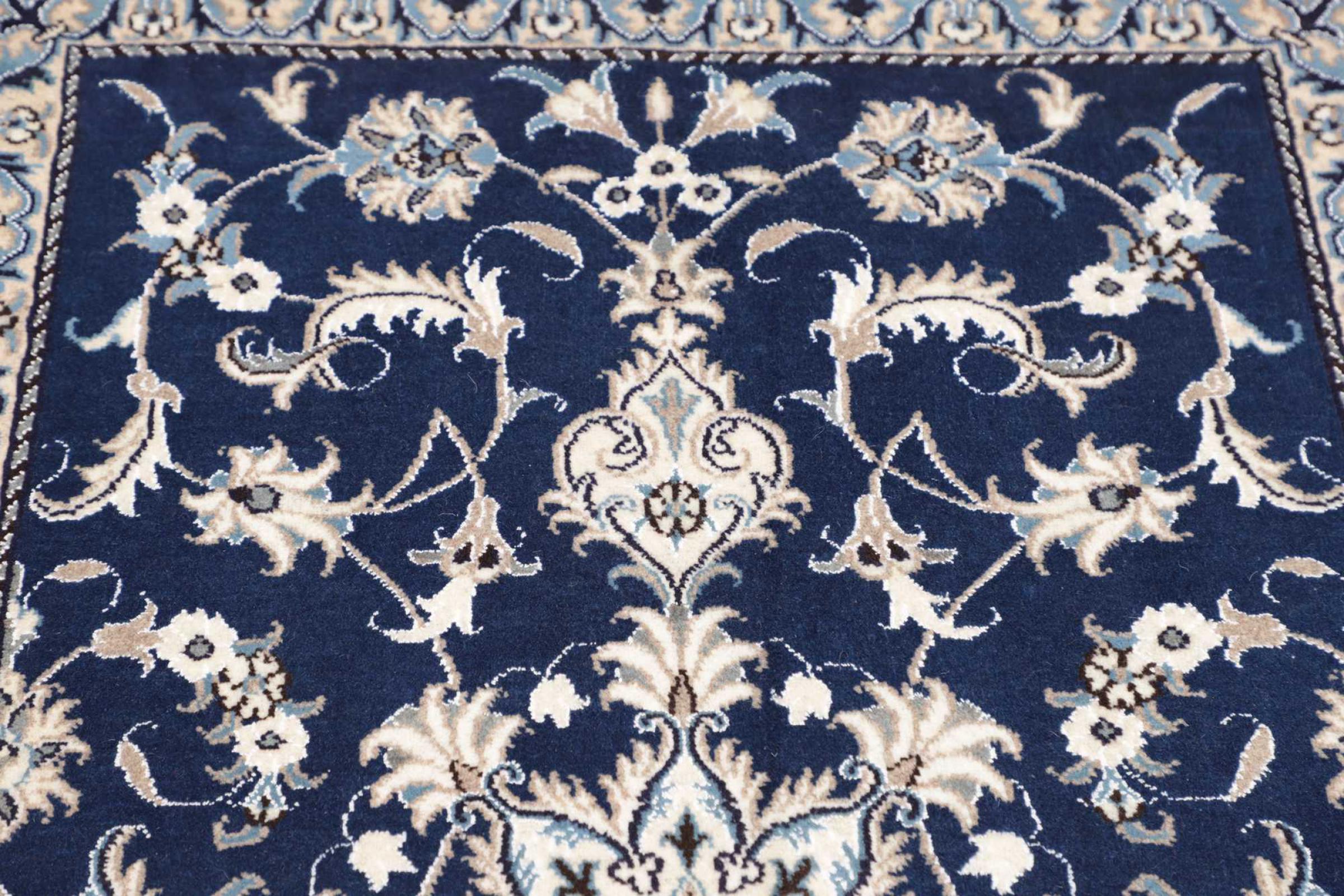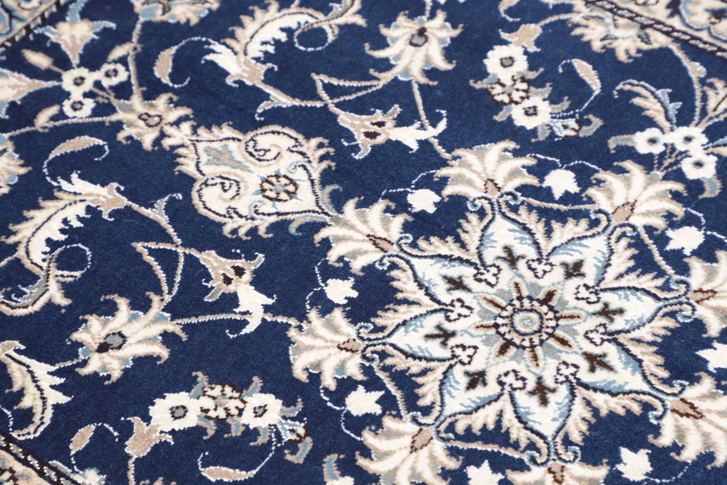 Dit Nain tapijt is geclassificeerd als 12La. Het heeft een elegante en verfijnde look met zijn typische Nain-kleuring. Dit Perzische tapijt werd met de hand geknoopt in de stad Nain, gelegen aan het westelijke uiteinde van de Dasht-e-Kavir woestijn, uit wol van hoge kwaliteit en natuurlijke zijde. Met zijn grootte van 12La is het niet zo fijn gedetailleerd met ornamenten als een Nain 9La of 6La.