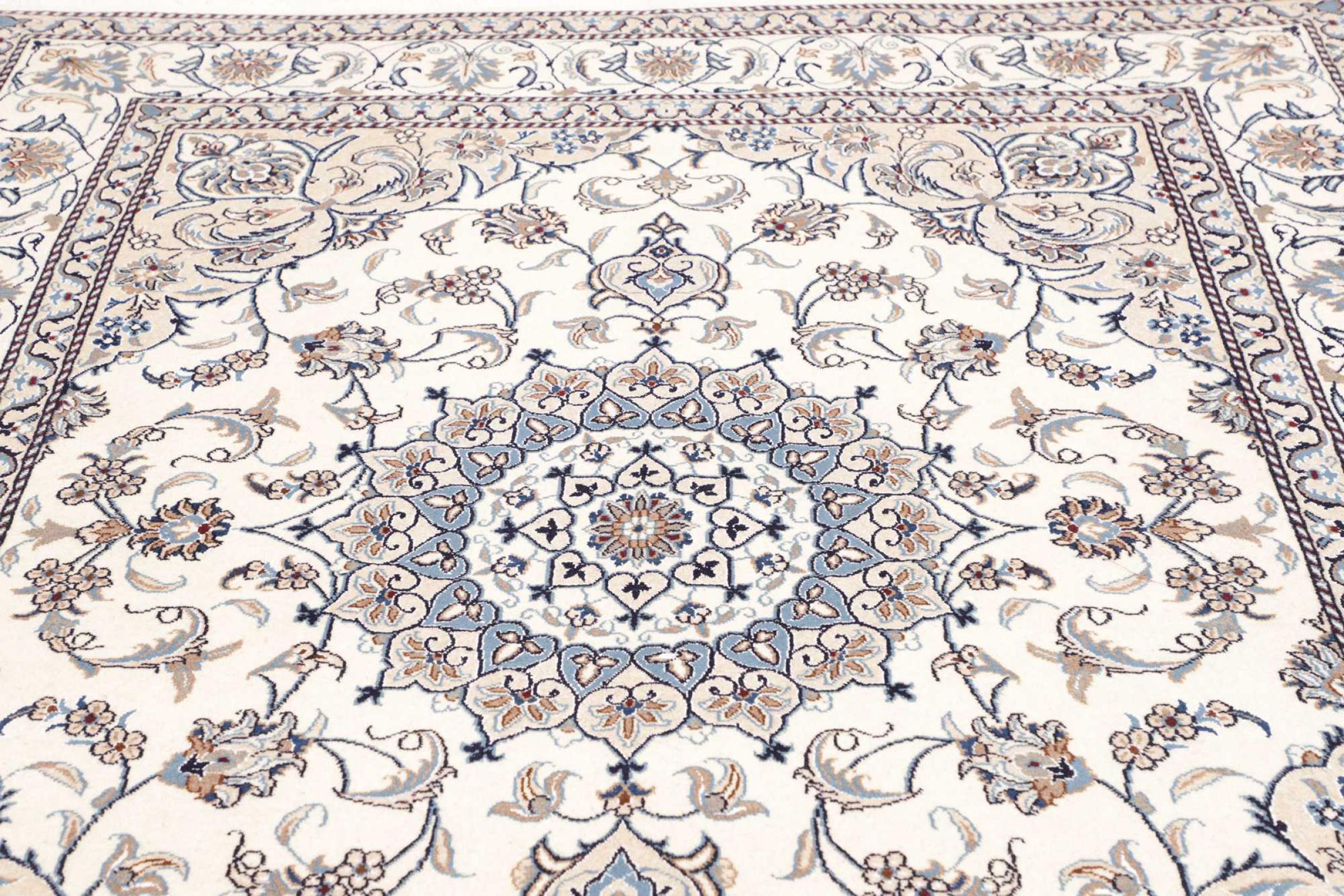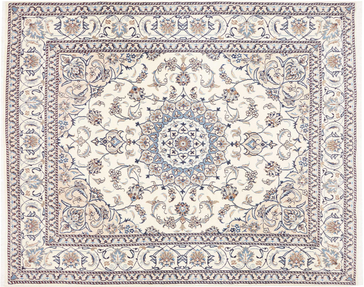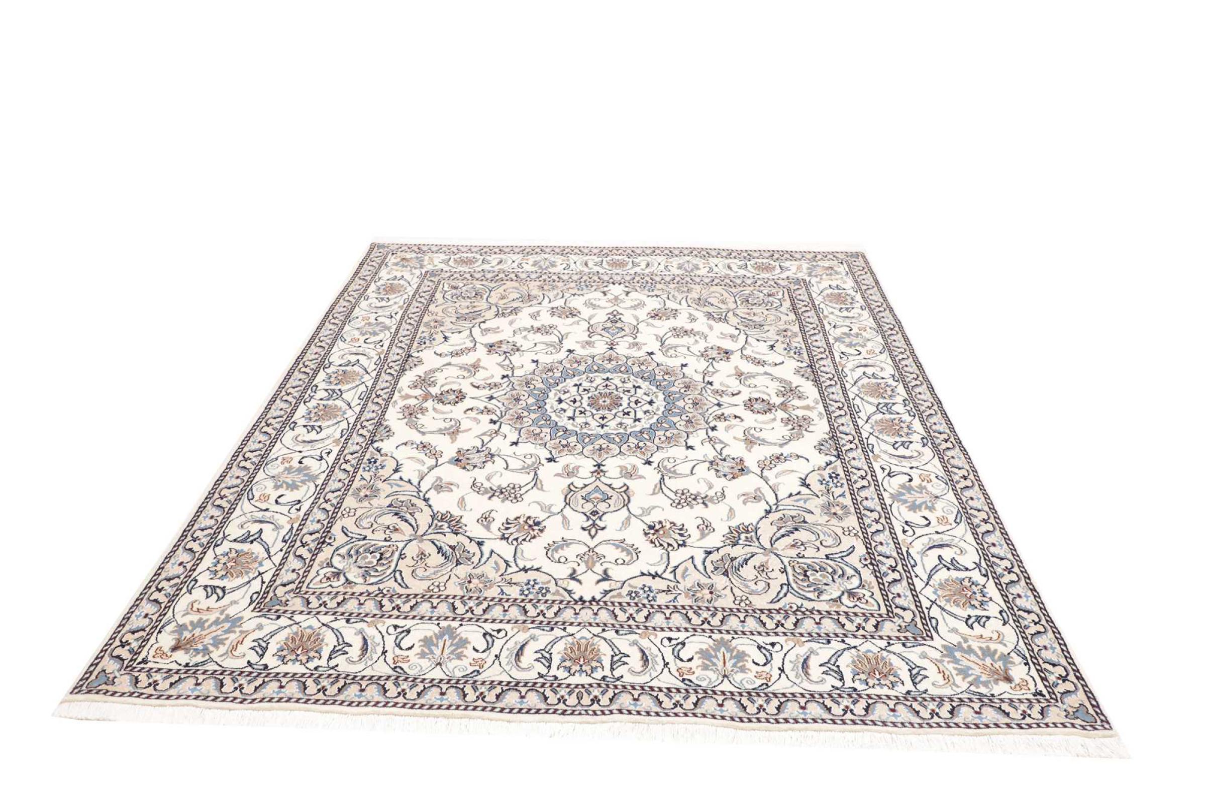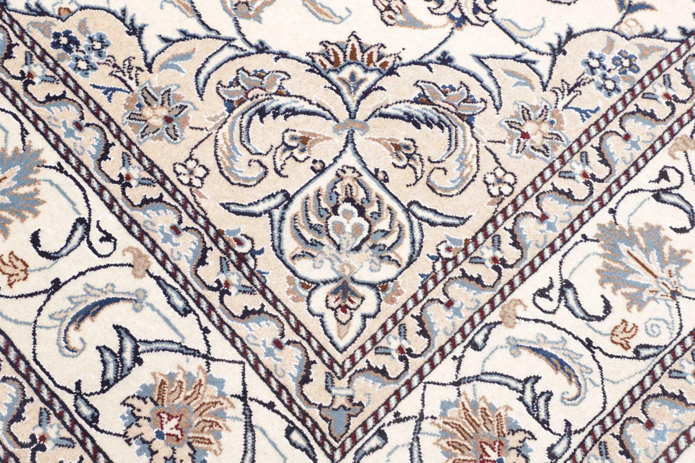 Dit Nain tapijt is geclassificeerd als 12La. Het heeft een elegante en verfijnde look met zijn typische Nain-kleuring. Dit Perzische tapijt werd met de hand geknoopt in de stad Nain, gelegen aan het westelijke uiteinde van de Dasht-e-Kavir woestijn, uit wol van hoge kwaliteit en natuurlijke zijde. Met zijn grootte van 12La is het niet zo fijn gedetailleerd met ornamenten als een Nain 9La of 6La.
