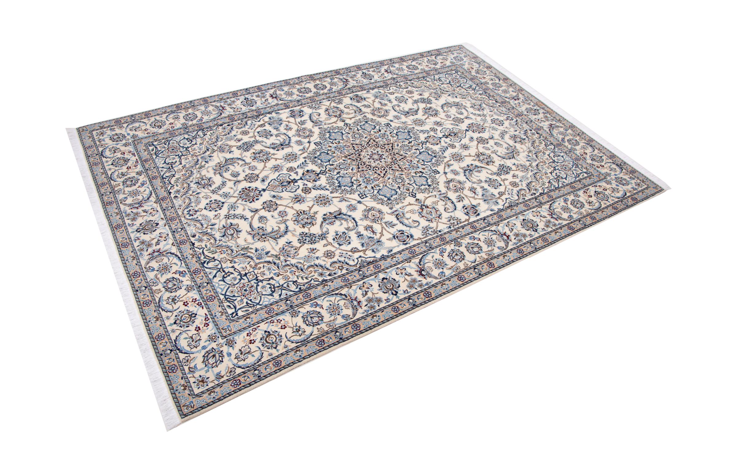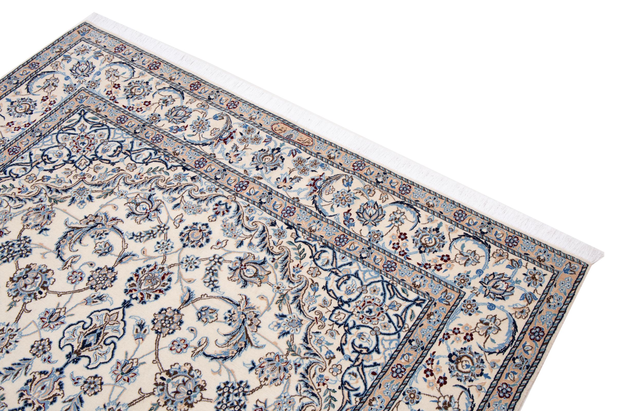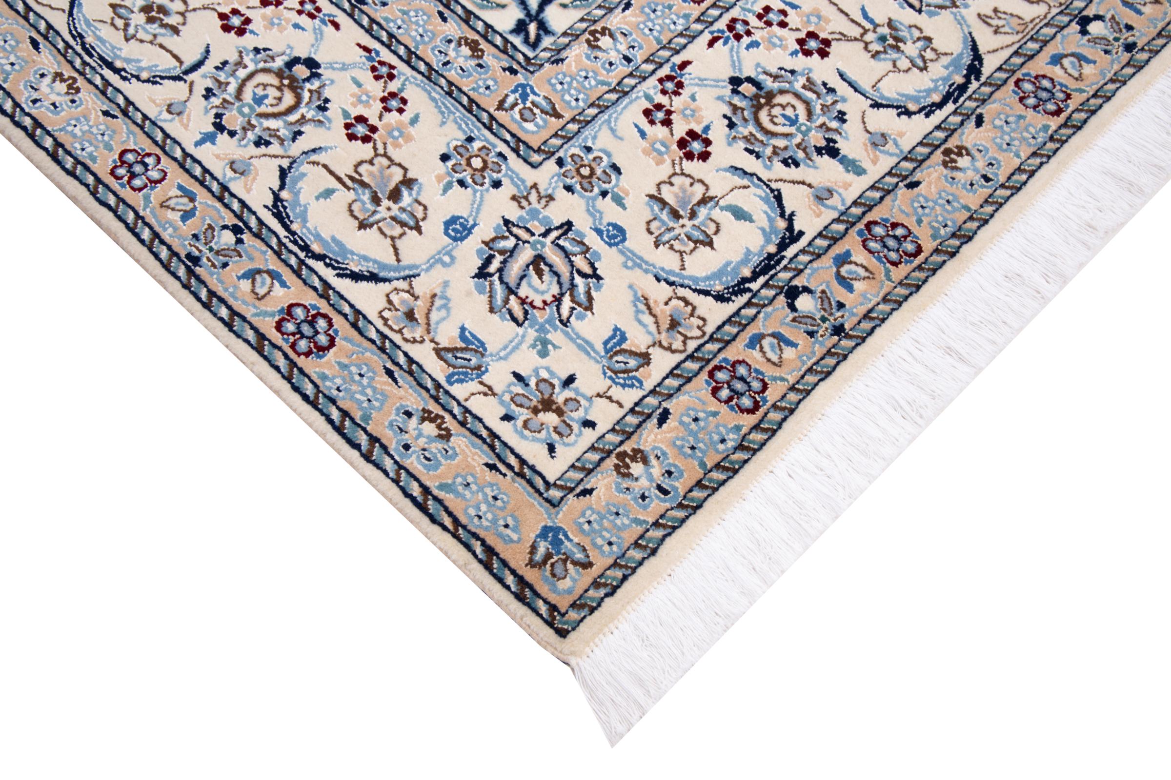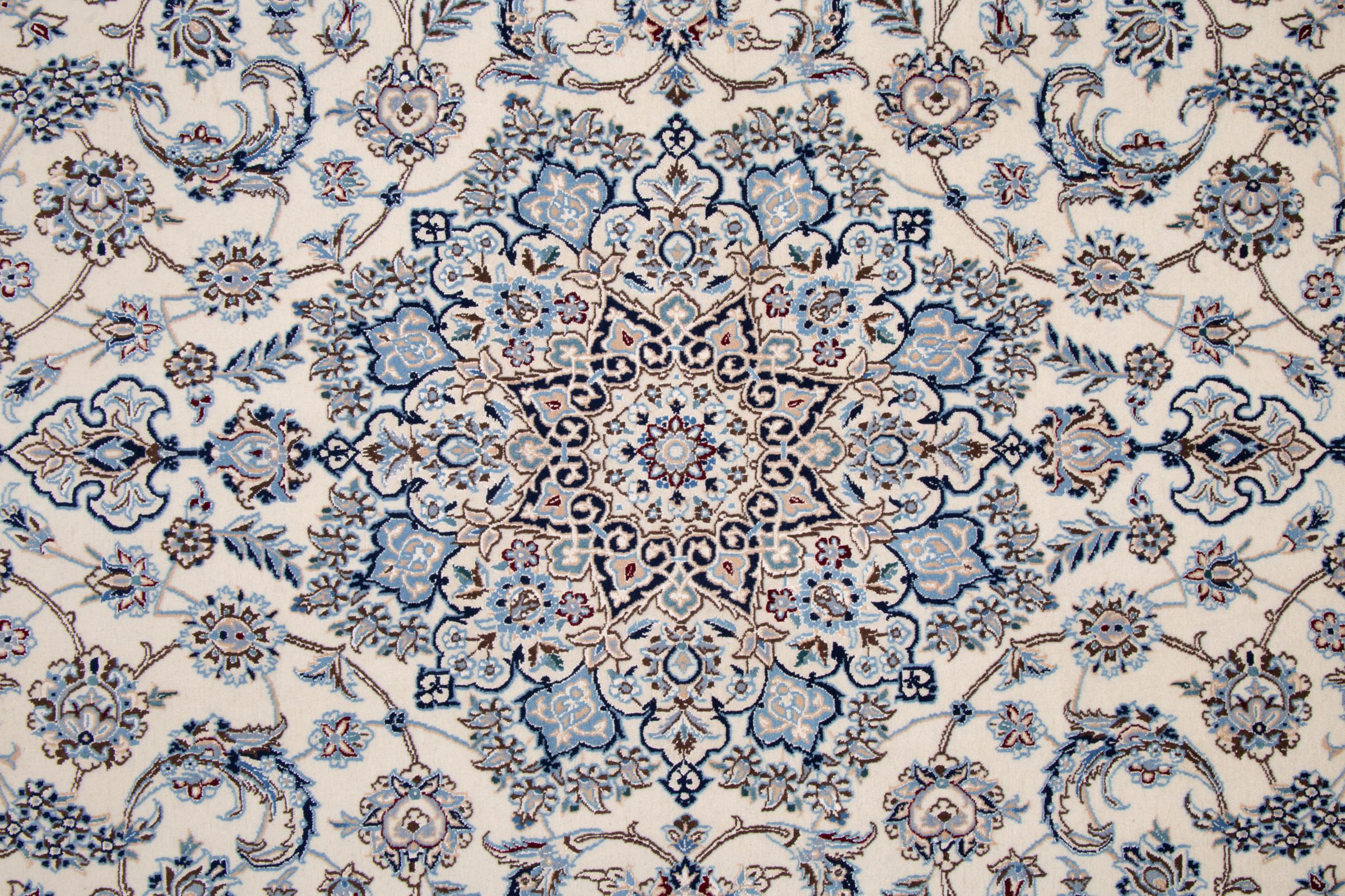 Dit Nain-tapijt heeft een beoordeling van 9La. De uitstekende kwaliteit en het prachtige oosterse ontwerp met zijn ronde patronen zullen elke koper bekoren. Dit Perzische tapijt is handgemaakt in de stad Nain, gelegen aan de westelijke rand van de Dasht-e-Kavir-woestijn, van hoogwaardige wol en natuurlijke zijde. 9La Nain zijn duidelijk dunner dan een 12La en laten al mooie details zien.