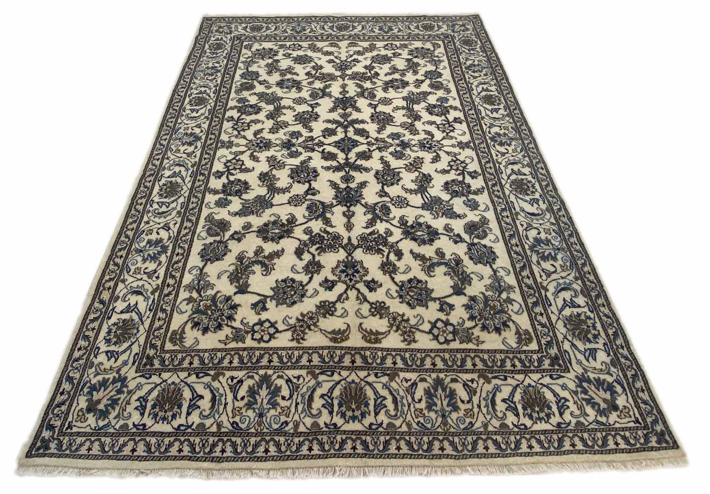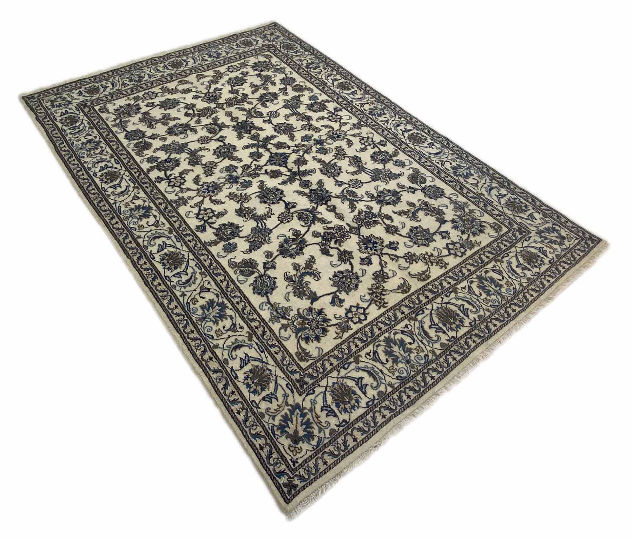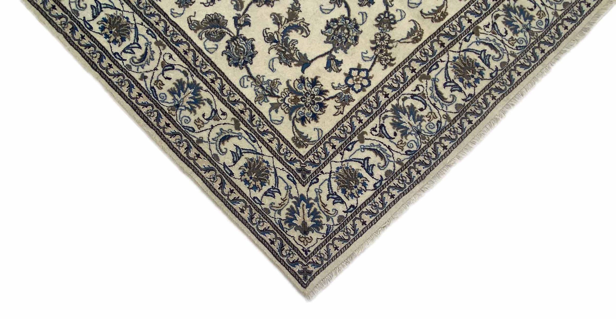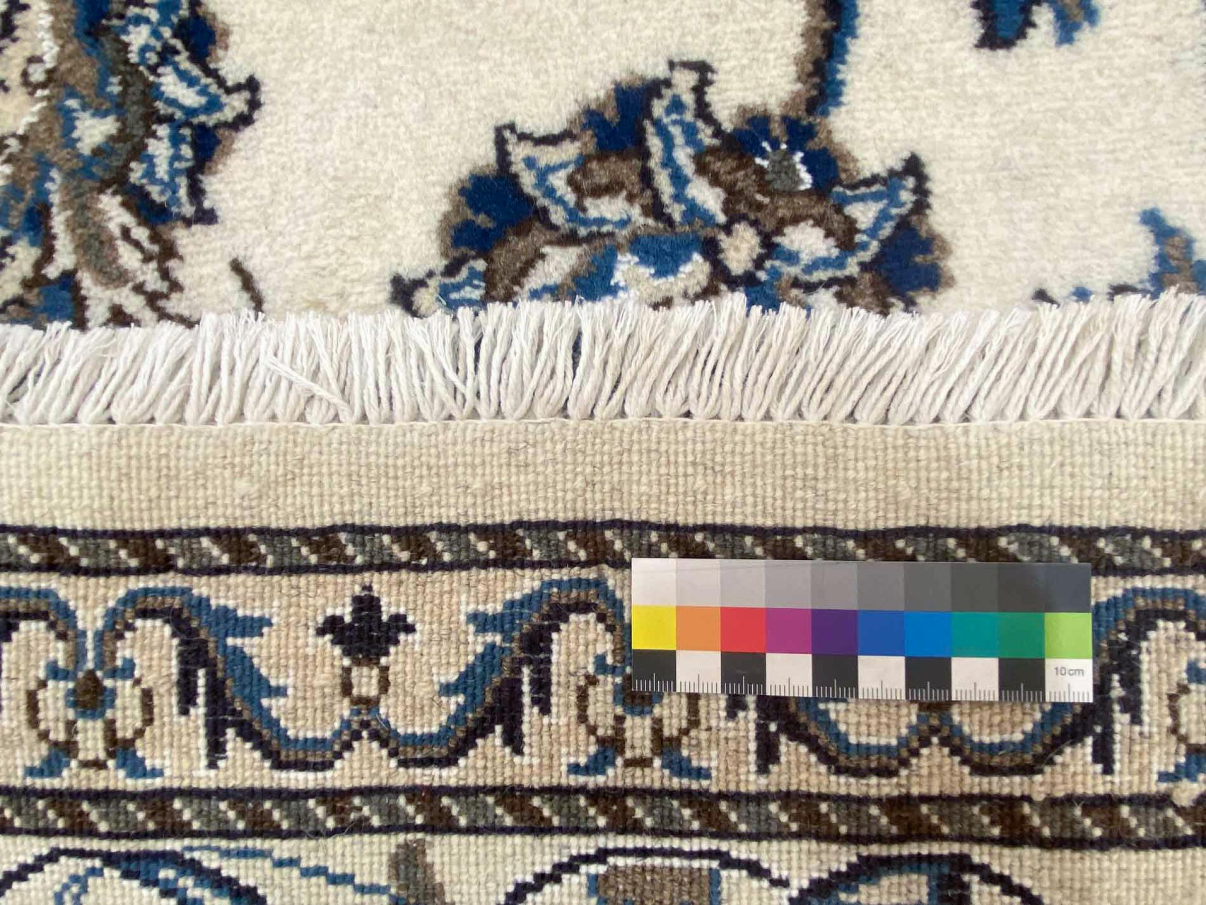Dit Nain tapijt is geclassificeerd als 12La. Het heeft een elegante en verfijnde look met zijn typische Nain-kleuring. Dit Perzische tapijt werd met de hand geknoopt in de stad Nain, gelegen aan het westelijke uiteinde van de Dasht-e-Kavir woestijn, uit wol van hoge kwaliteit en natuurlijke zijde. Met zijn grootte van 12La is het niet zo fijn gedetailleerd met ornamenten als een Nain 9La of 6La.