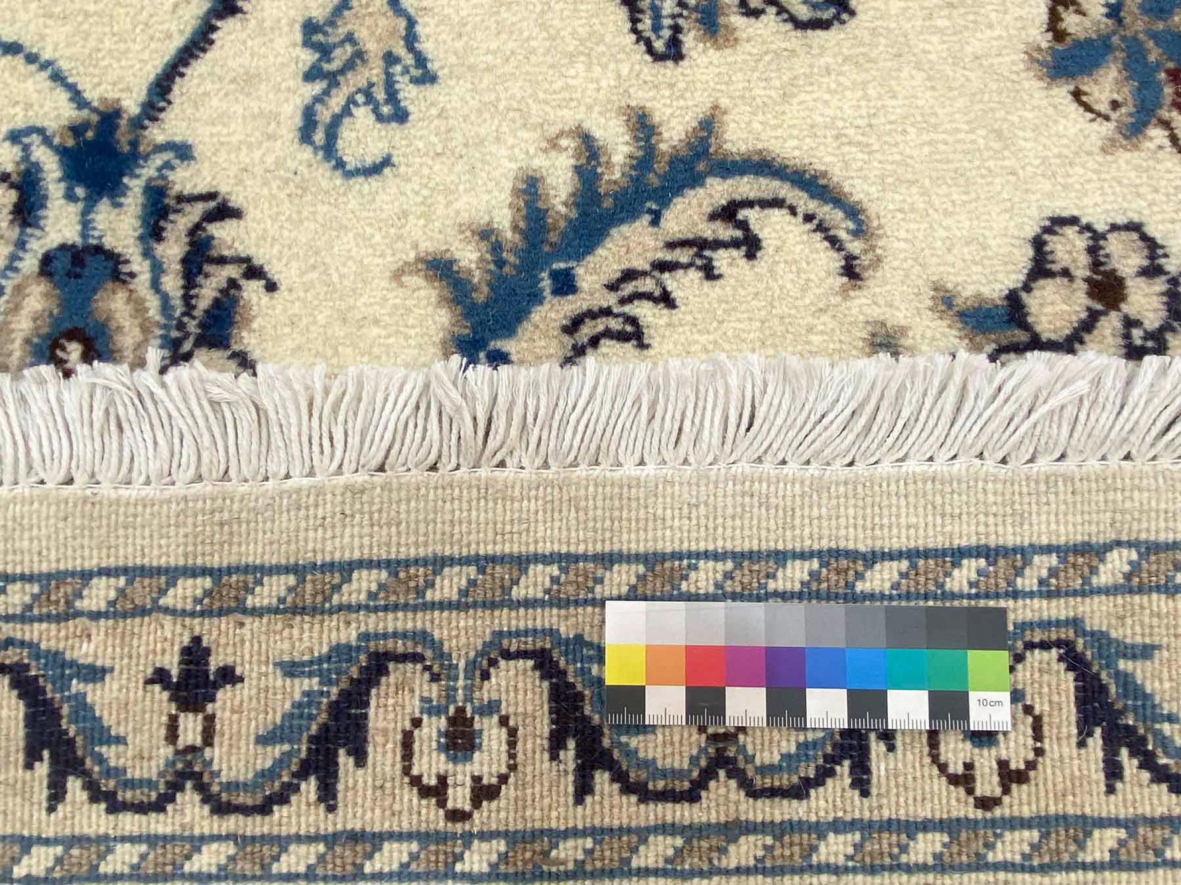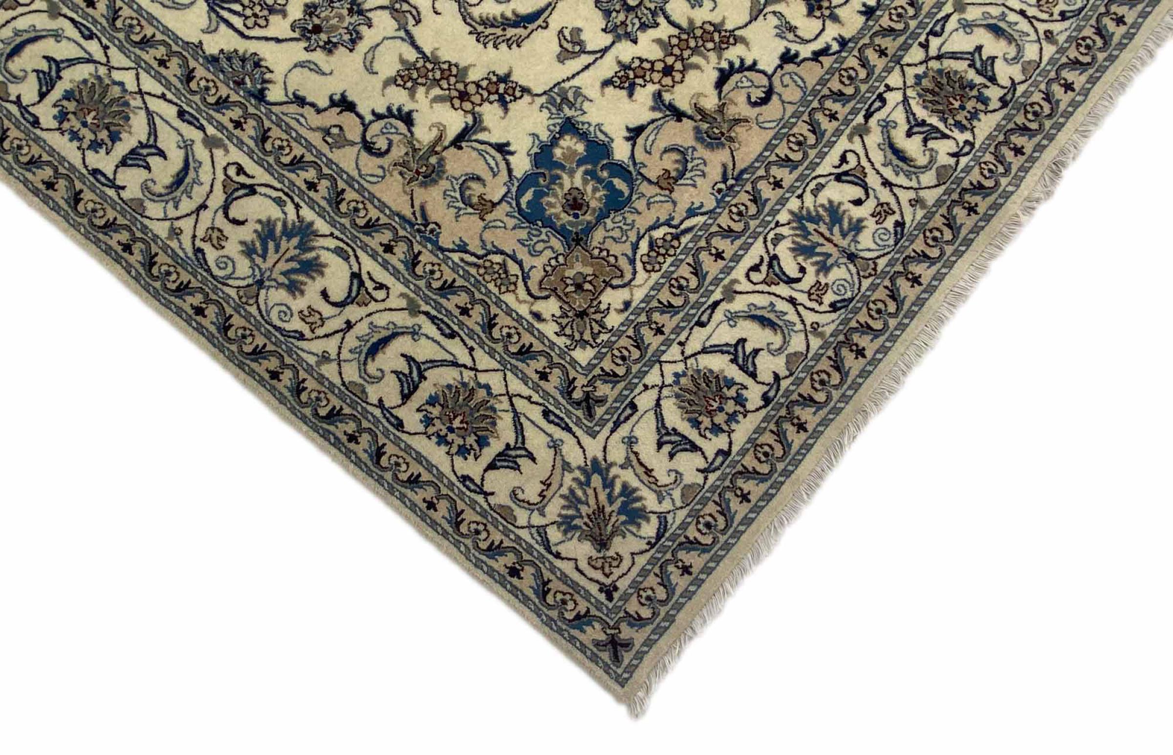 Dit Nain tapijt is geclassificeerd als 12La. Het heeft een elegante en verfijnde look met zijn typische Nain-kleuring. Dit Perzische tapijt werd met de hand geknoopt in de stad Nain, gelegen aan het westelijke uiteinde van de Dasht-e-Kavir woestijn, uit wol van hoge kwaliteit en natuurlijke zijde. Met zijn grootte van 12La is het niet zo fijn gedetailleerd met ornamenten als een Nain 9La of 6La.