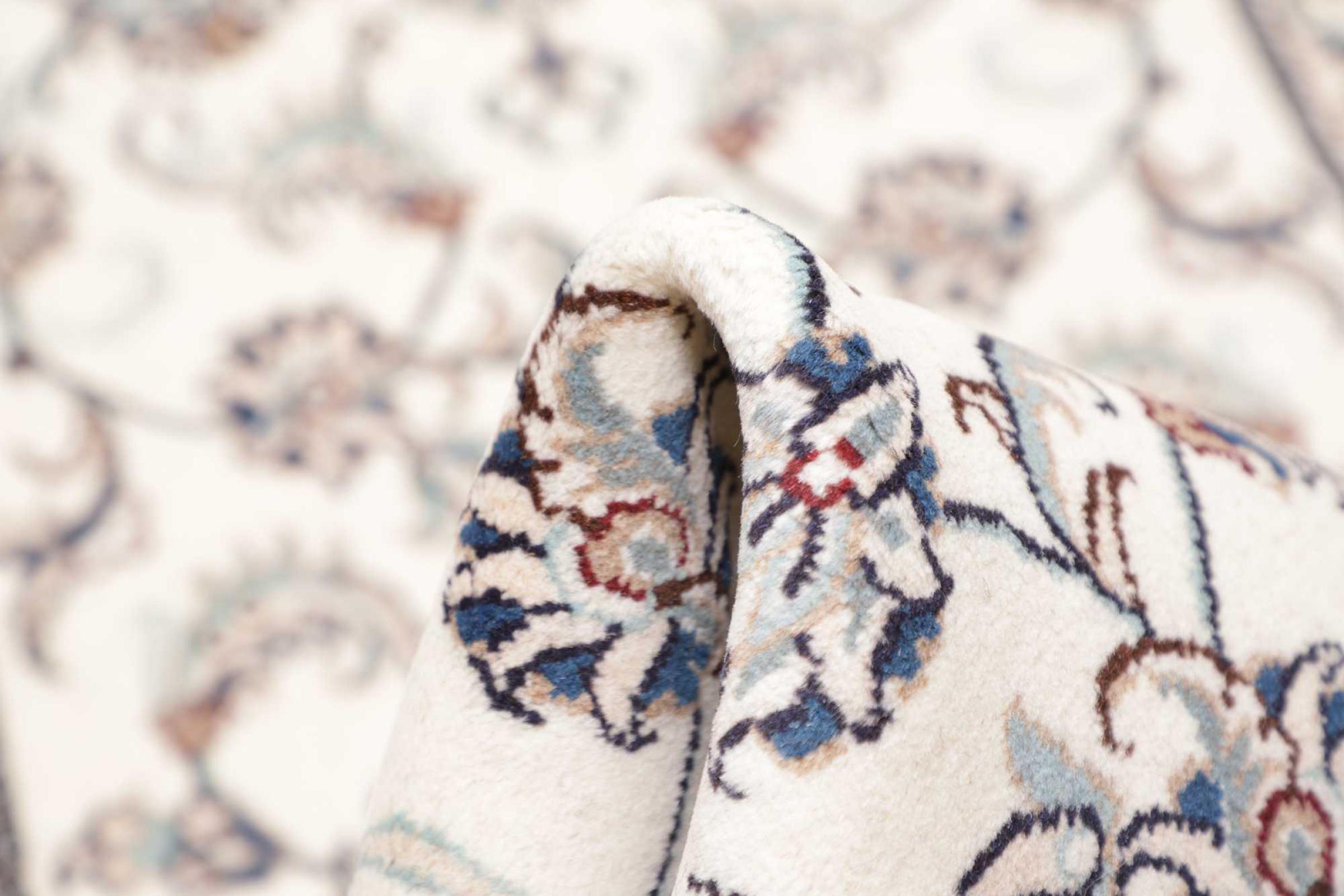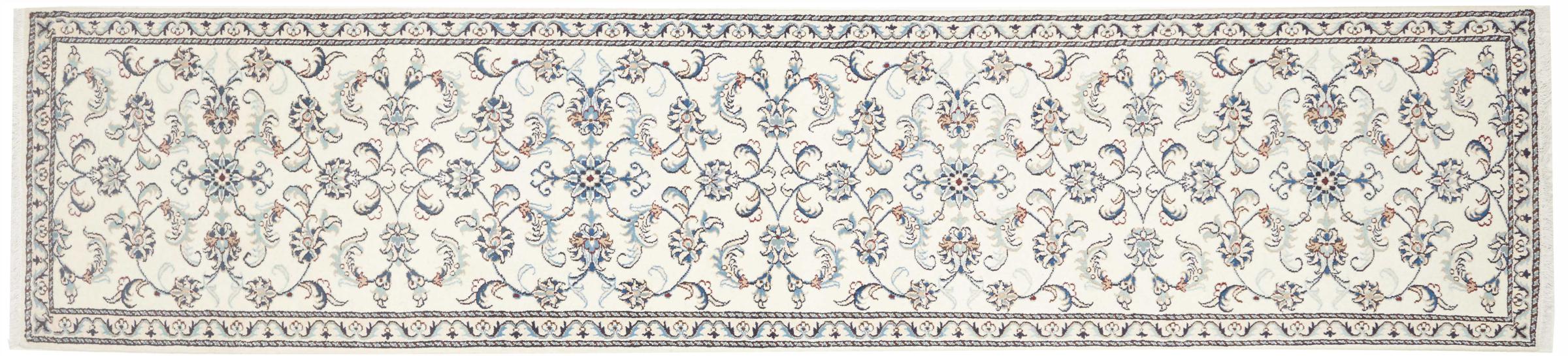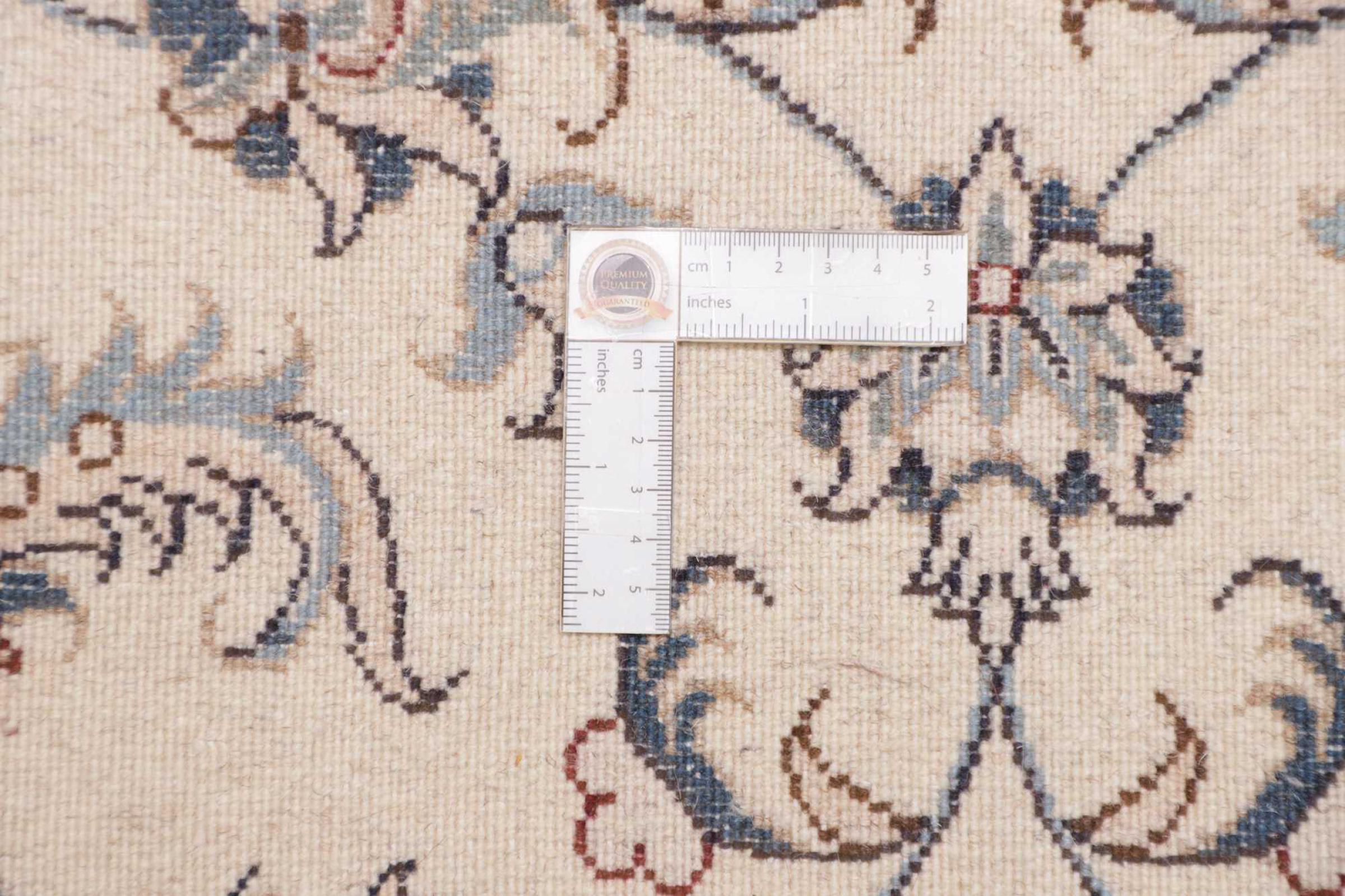 Dit Nain tapijt is geclassificeerd als 12La. Het heeft een elegante en verfijnde look met zijn typische Nain-kleuring. Dit Perzische tapijt werd met de hand geknoopt in de stad Nain, gelegen aan het westelijke uiteinde van de Dasht-e-Kavir woestijn, uit wol van hoge kwaliteit en natuurlijke zijde. Met zijn grootte van 12La is het niet zo fijn gedetailleerd met ornamenten als een Nain 9La of 6La.