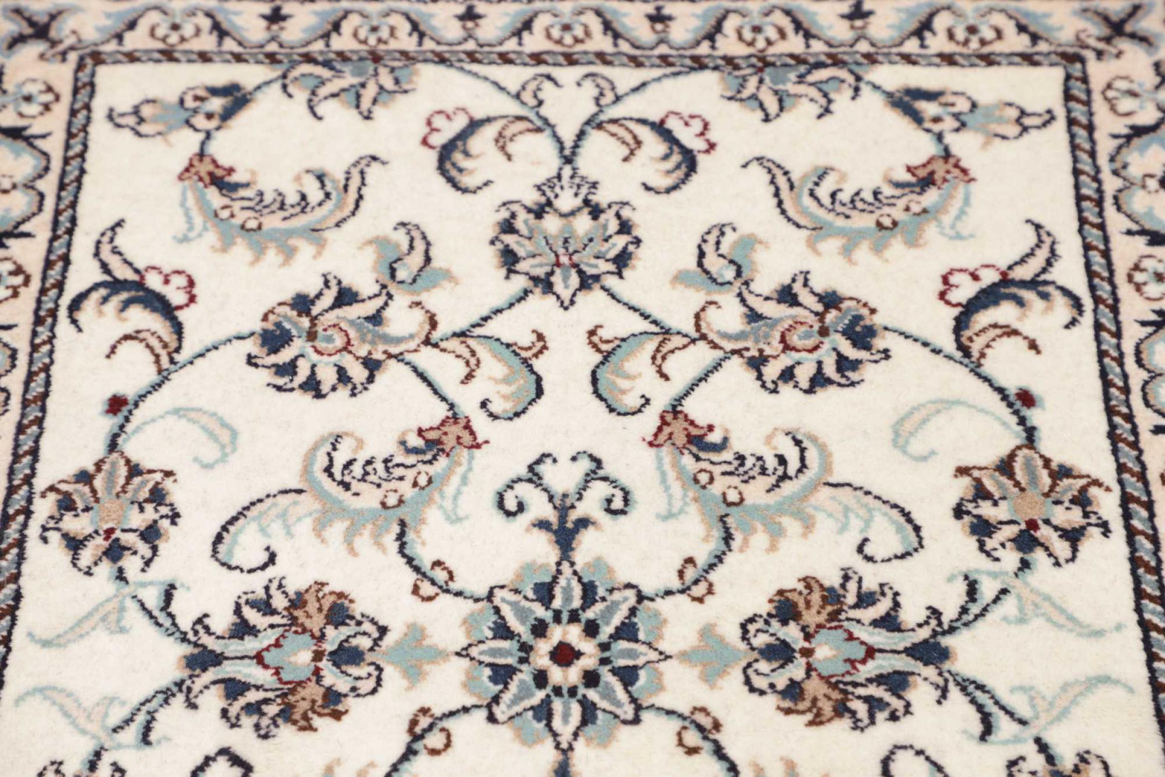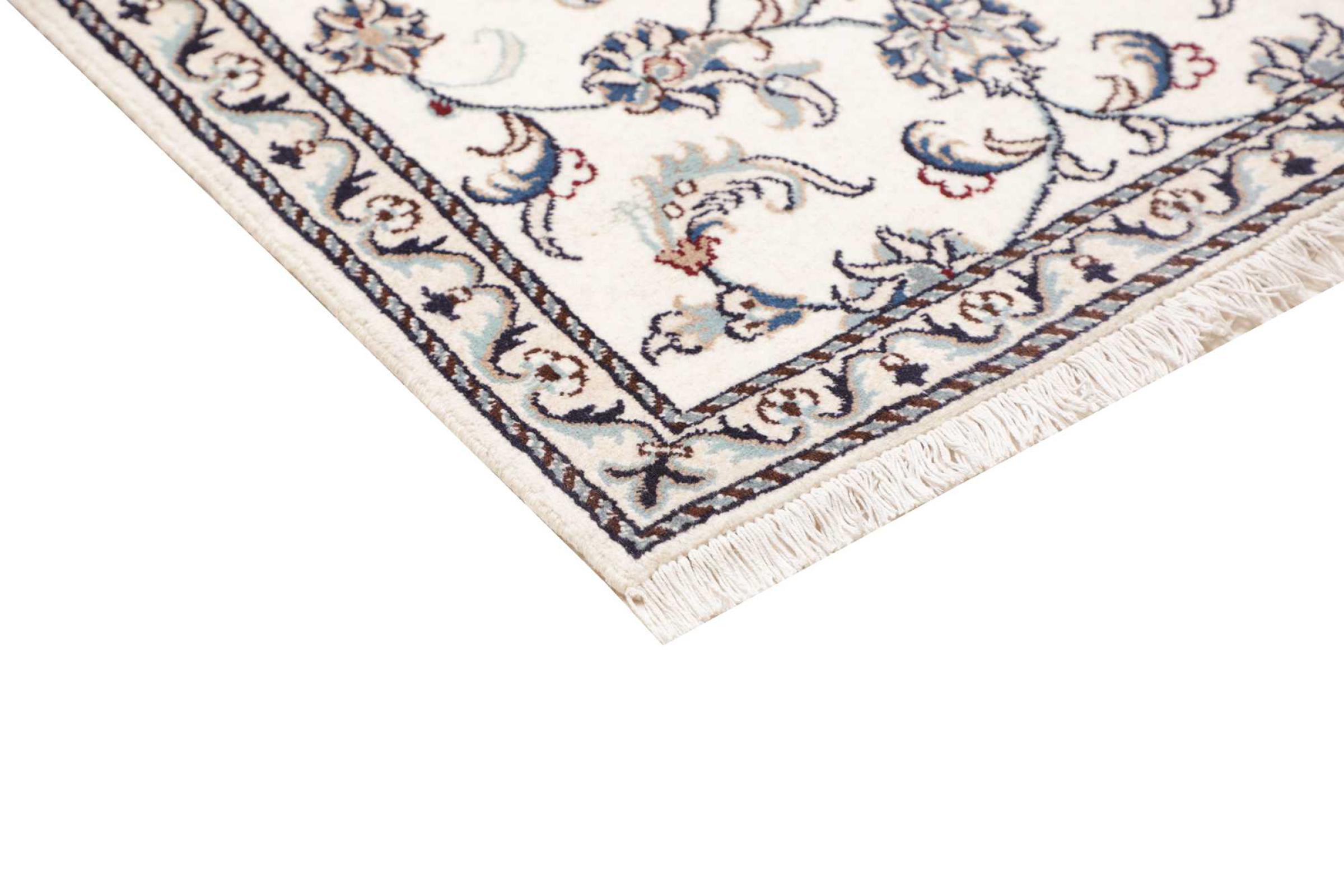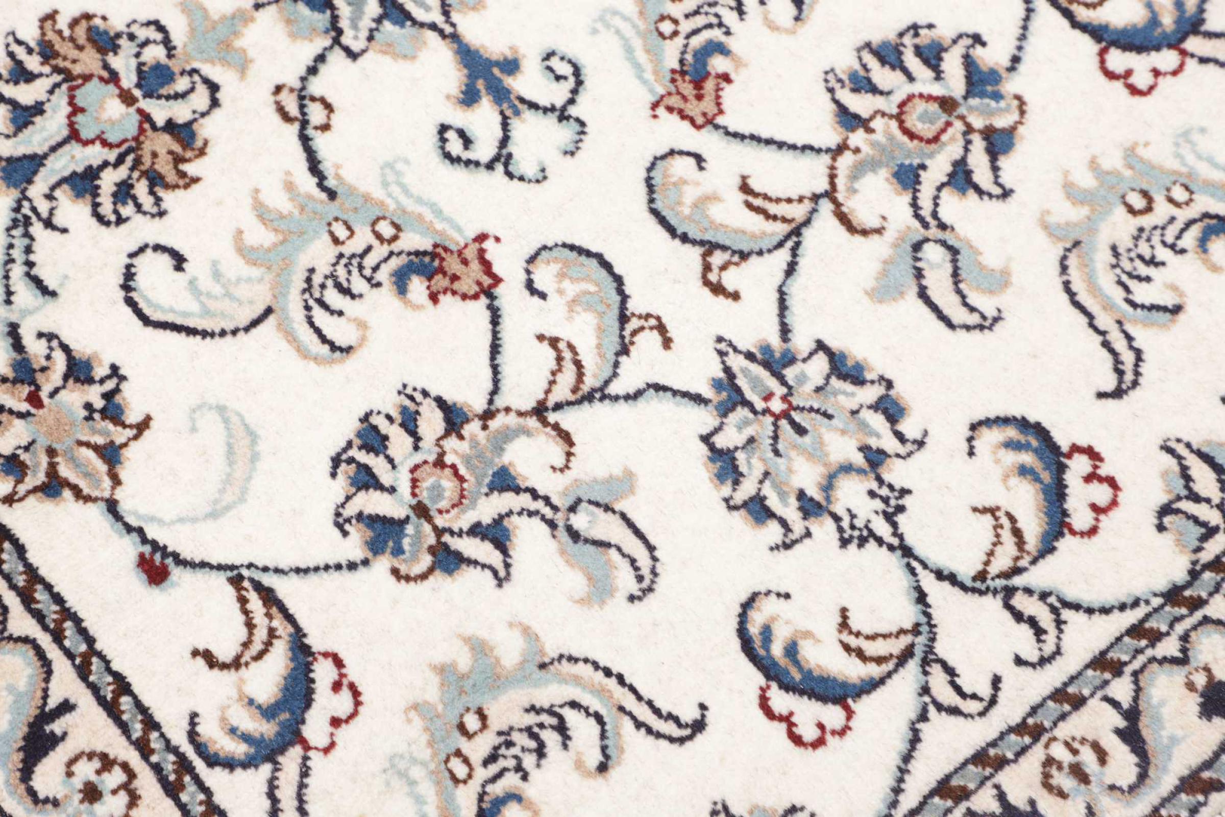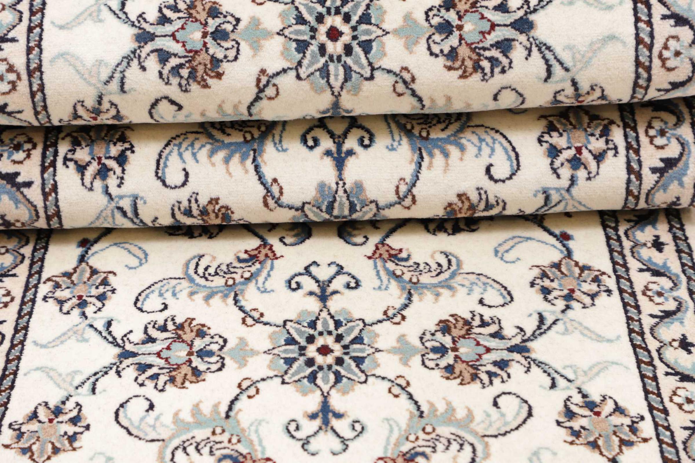 Dit Nain tapijt is geclassificeerd als 12La. Het heeft een elegante en verfijnde look met zijn typische Nain-kleuring. Dit Perzische tapijt werd met de hand geknoopt in de stad Nain, gelegen aan het westelijke uiteinde van de Dasht-e-Kavir woestijn, uit wol van hoge kwaliteit en natuurlijke zijde. Met zijn grootte van 12La is het niet zo fijn gedetailleerd met ornamenten als een Nain 9La of 6La.