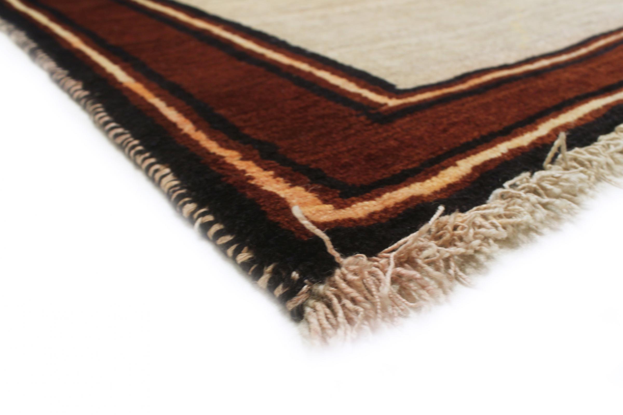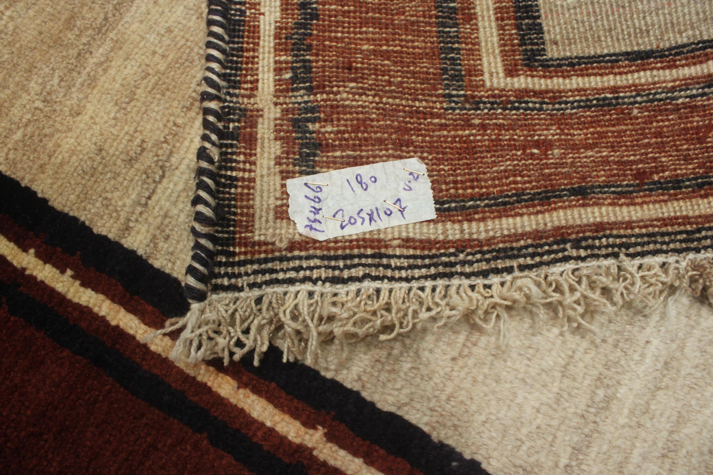 Tapijt ID: 29576007888107 Grootte: 204x106 cm Dikte: ap. 18 mm Knoopdichtheid: 72 000 - 90 000 / m² Verwerking: Handgeknoopte Pool: Hand gesponnen wol Schering: Wol Oorsprong: Perzië / Iran Leeftijd: Nieuw Gewicht: ap. 11 kg Ook wel bekend als Gabbe, Ghabbeh Op voorraad: Uniek - Nog maar 1 op voorraad