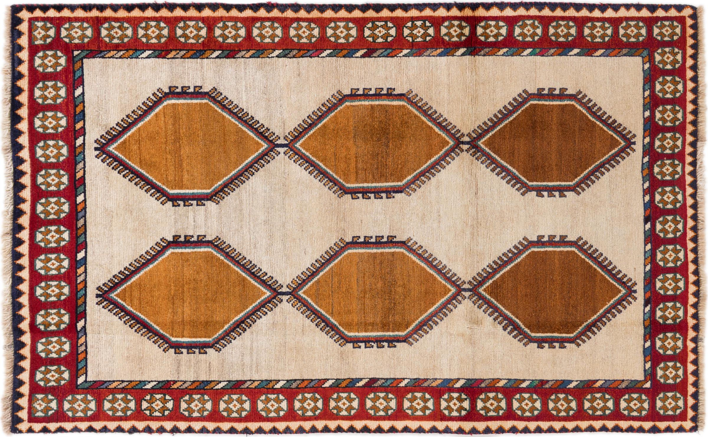 Tapijt ID: 298172008532 Grootte: 176x107 cm Dikte: ap. 15 mm Knoopdichtheid: 72 000 - 90 000 / m² Verwerking: Handgeknoopte Pool: Hand gesponnen wol Schering: Wol Oorsprong: Perzië / Iran Leeftijd: Oud/Semi antiek, boven 50 jaar Gewicht: ap. 8 kg Ook wel bekend als Gabbe, Ghabbeh Op voorraad: Uniek - Nog maar 1 op voorraad