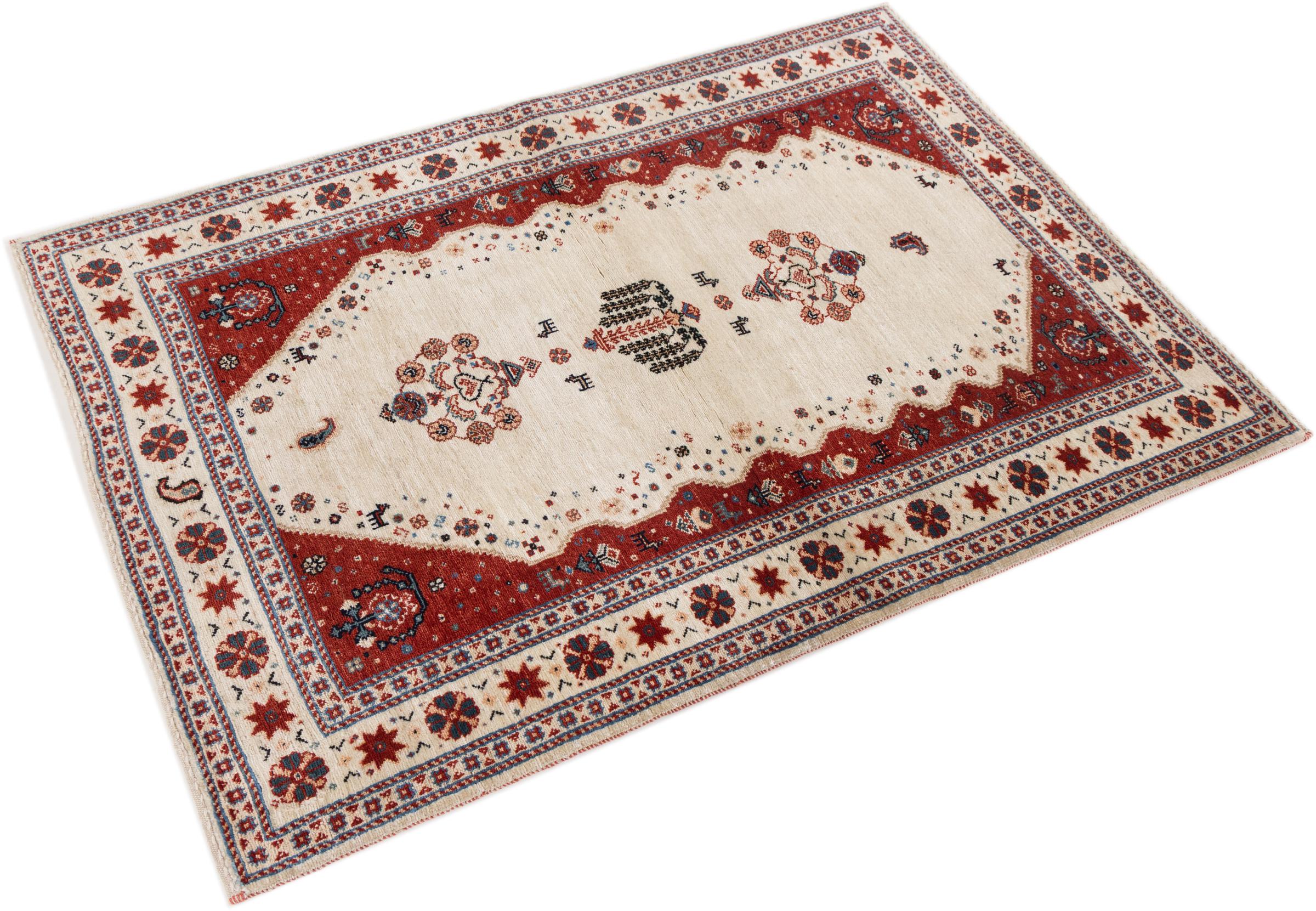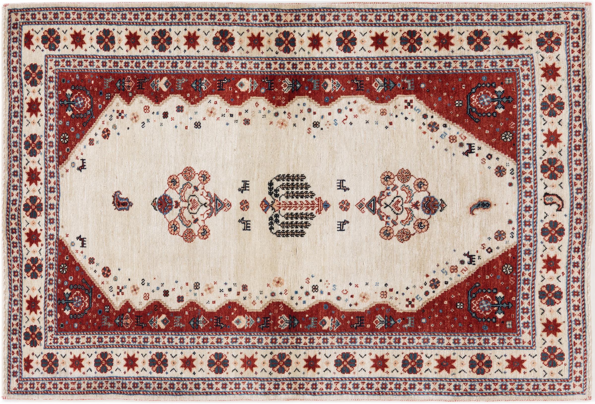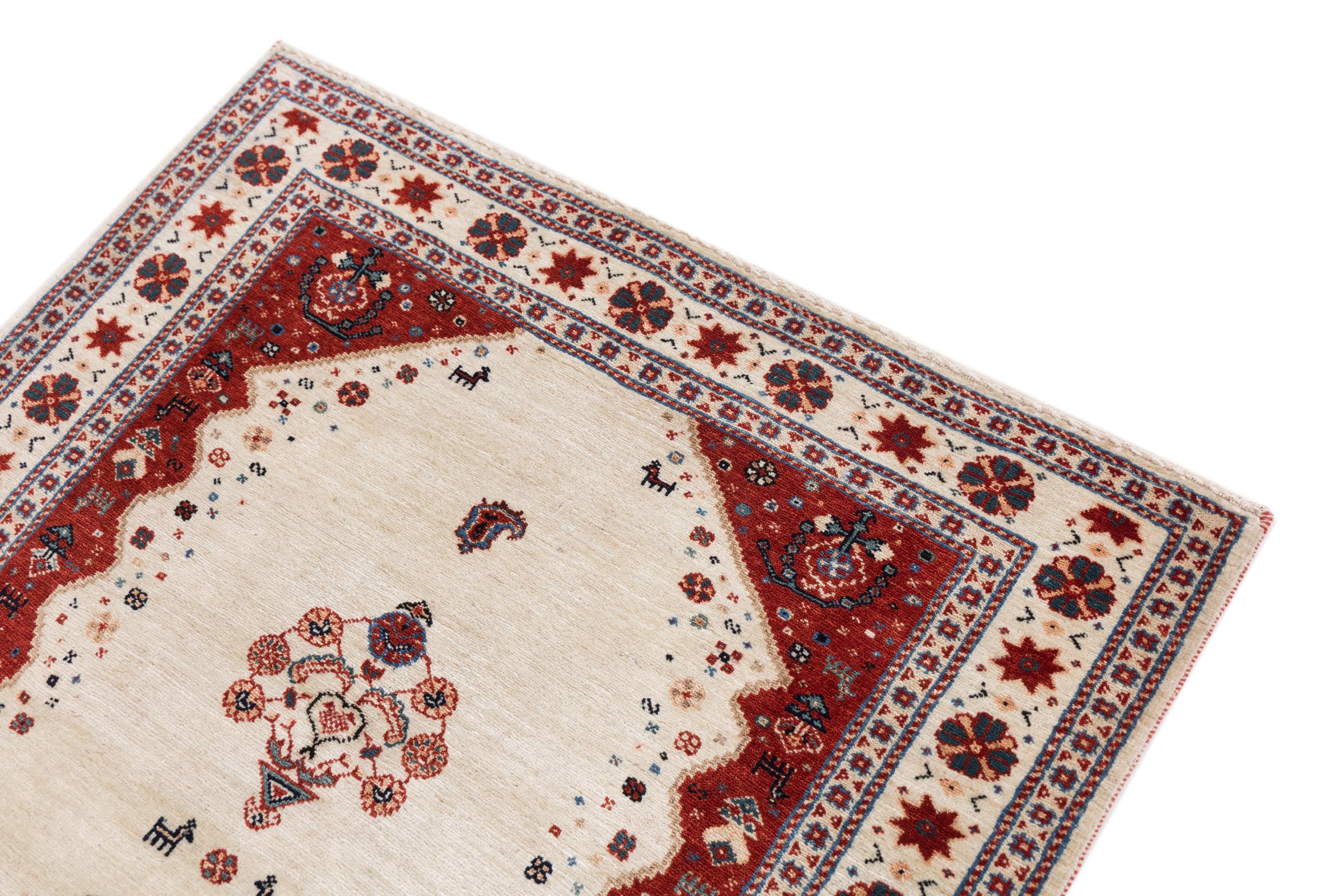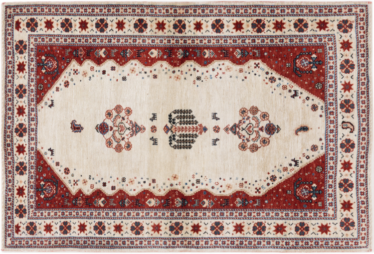 Tapijt ID: 298188008505 Grootte: 151x101 cm Dikte: ap. 12 mm Knoopdichtheid: 200 000 - 250 000 / m² Verwerking: Handgeknoopte Pool: Hand gesponnen wol Schering: Wol Oorsprong: Perzië / Iran Leeftijd: Nieuw Gewicht: ap. 5 kg Op voorraad: Uniek - Nog maar 1 op voorraad