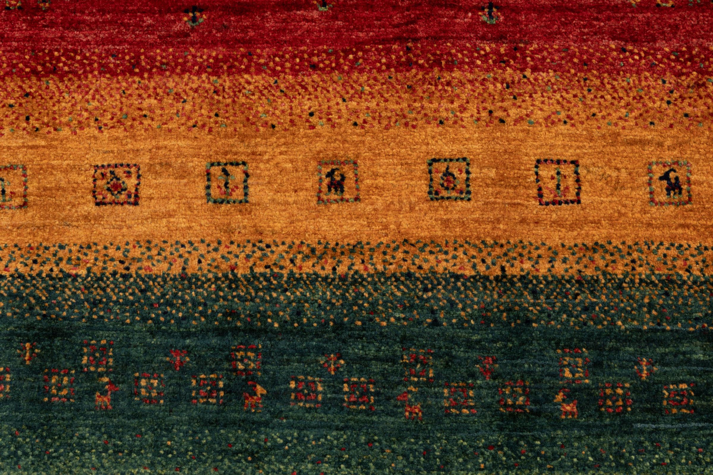 Een verfijning van de al bekende Gabbeh-tapijten: Dit is deze Perzische Gabbeh Loribaft. Het weet indruk te maken met zijn fijnere weefsel en prachtige ontwerp. Het werd door Loren in het zuiden van Perzië met de hand geknoopt van de beste handgesponnen schapenwol. Voor het verven van de wol worden uitsluitend pure plantaardige kleurstoffen gebruikt. Met dit vloerkleed haal je de hoogste standaard van een Gabbeh-tapijt in huis.