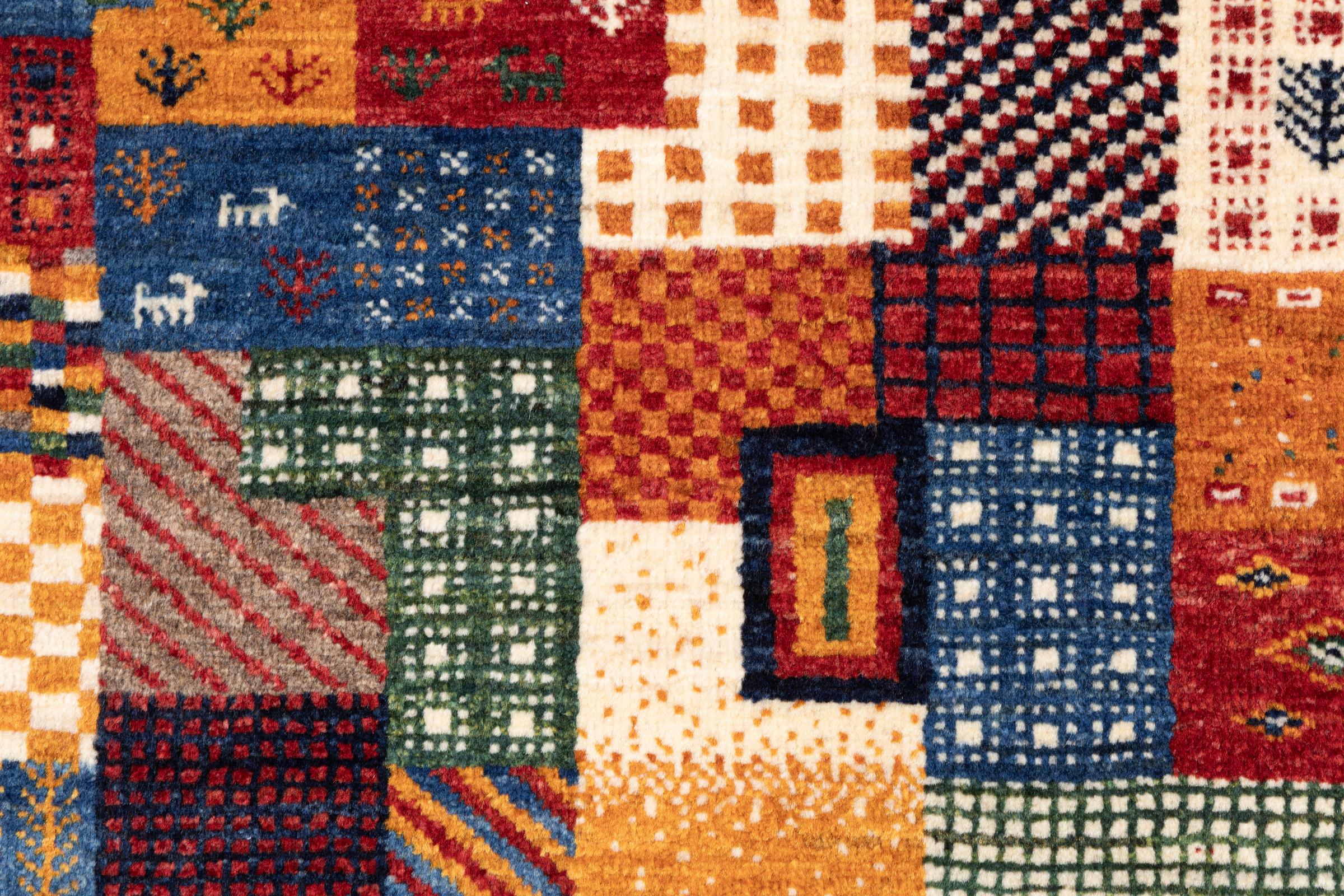 Een verfijning van de al bekende Gabbeh-tapijten: Dit is deze Perzische Gabbeh Loribaft. Het weet indruk te maken met zijn fijnere weefsel en prachtige ontwerp. Het werd door Loren in het zuiden van Perzië met de hand geknoopt van de beste handgesponnen schapenwol. Voor het verven van de wol worden uitsluitend pure plantaardige kleurstoffen gebruikt. Met dit vloerkleed haal je de hoogste standaard van een Gabbeh-tapijt in huis.
