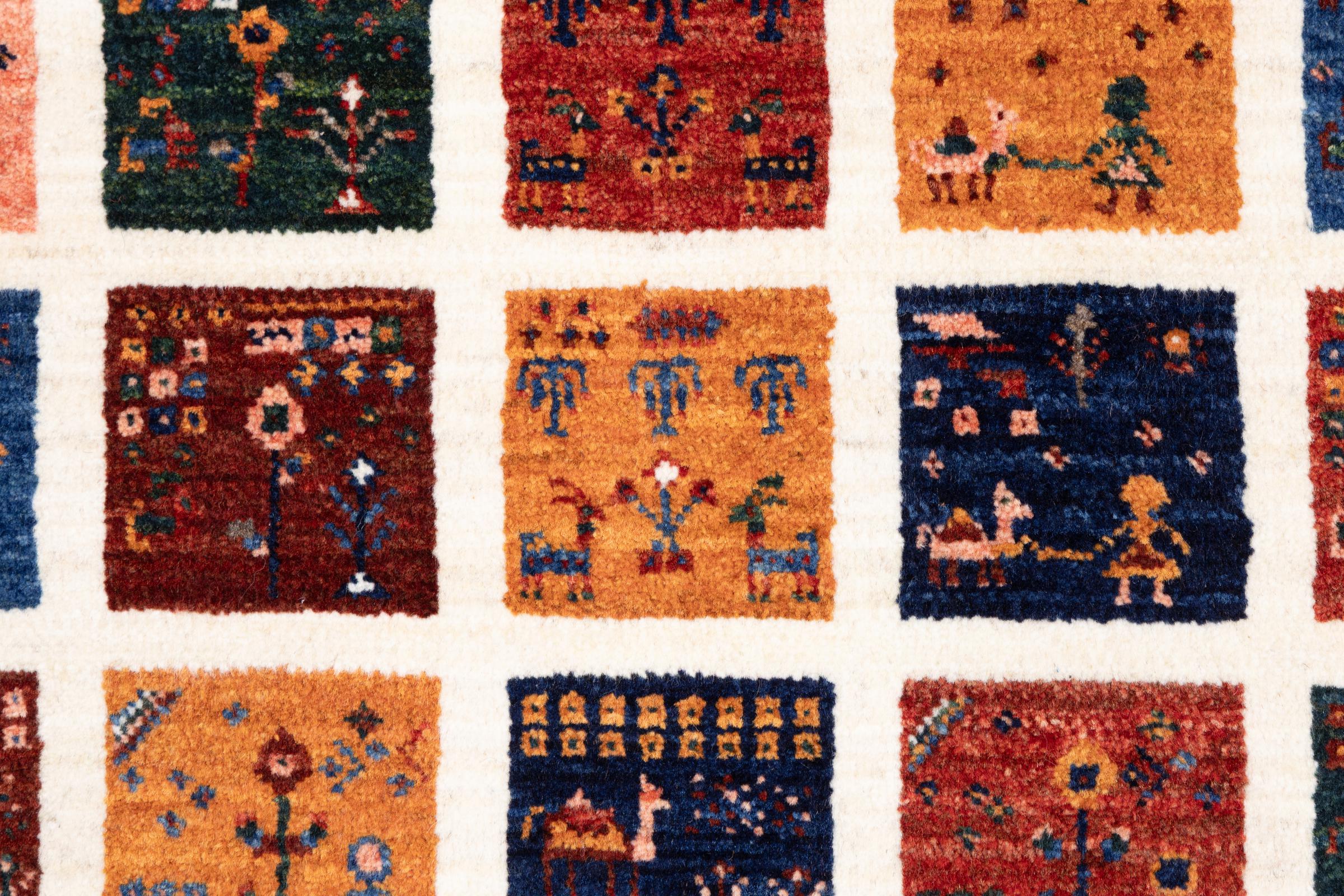 Een verfijning van de al bekende Gabbeh-tapijten: Dit is deze Perzische Gabbeh Loribaft. Het weet indruk te maken met zijn fijnere weefsel en prachtige ontwerp. Het werd door Loren in het zuiden van Perzië met de hand geknoopt van de beste handgesponnen schapenwol. Voor het verven van de wol worden uitsluitend pure plantaardige kleurstoffen gebruikt. Met dit vloerkleed haal je de hoogste standaard van een Gabbeh-tapijt in huis.