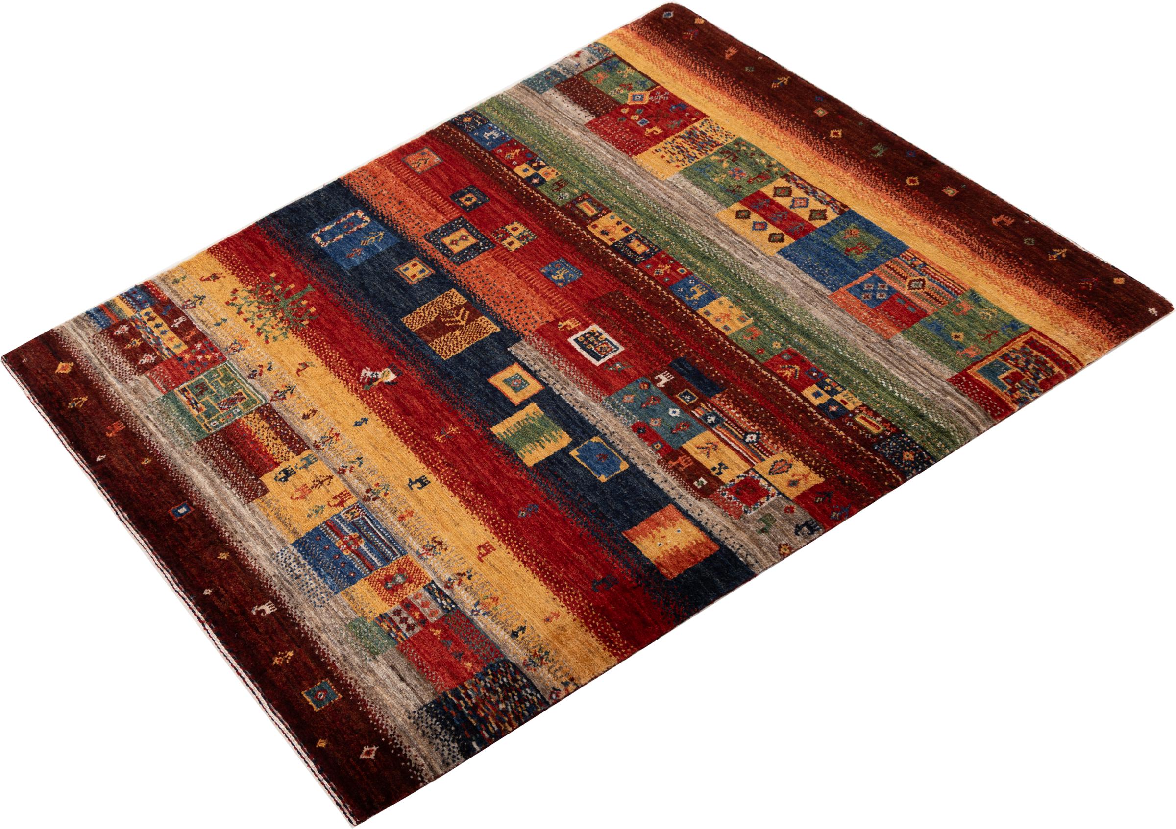 Een verfijning van de al bekende Gabbeh-tapijten: Dit is deze Perzische Gabbeh Loribaft. Het weet indruk te maken met zijn fijnere weefsel en prachtige ontwerp. Het werd door Loren in het zuiden van Perzië met de hand geknoopt van de beste handgesponnen schapenwol. Voor het verven van de wol worden uitsluitend pure plantaardige kleurstoffen gebruikt. Met dit vloerkleed haal je de hoogste standaard van een Gabbeh-tapijt in huis.