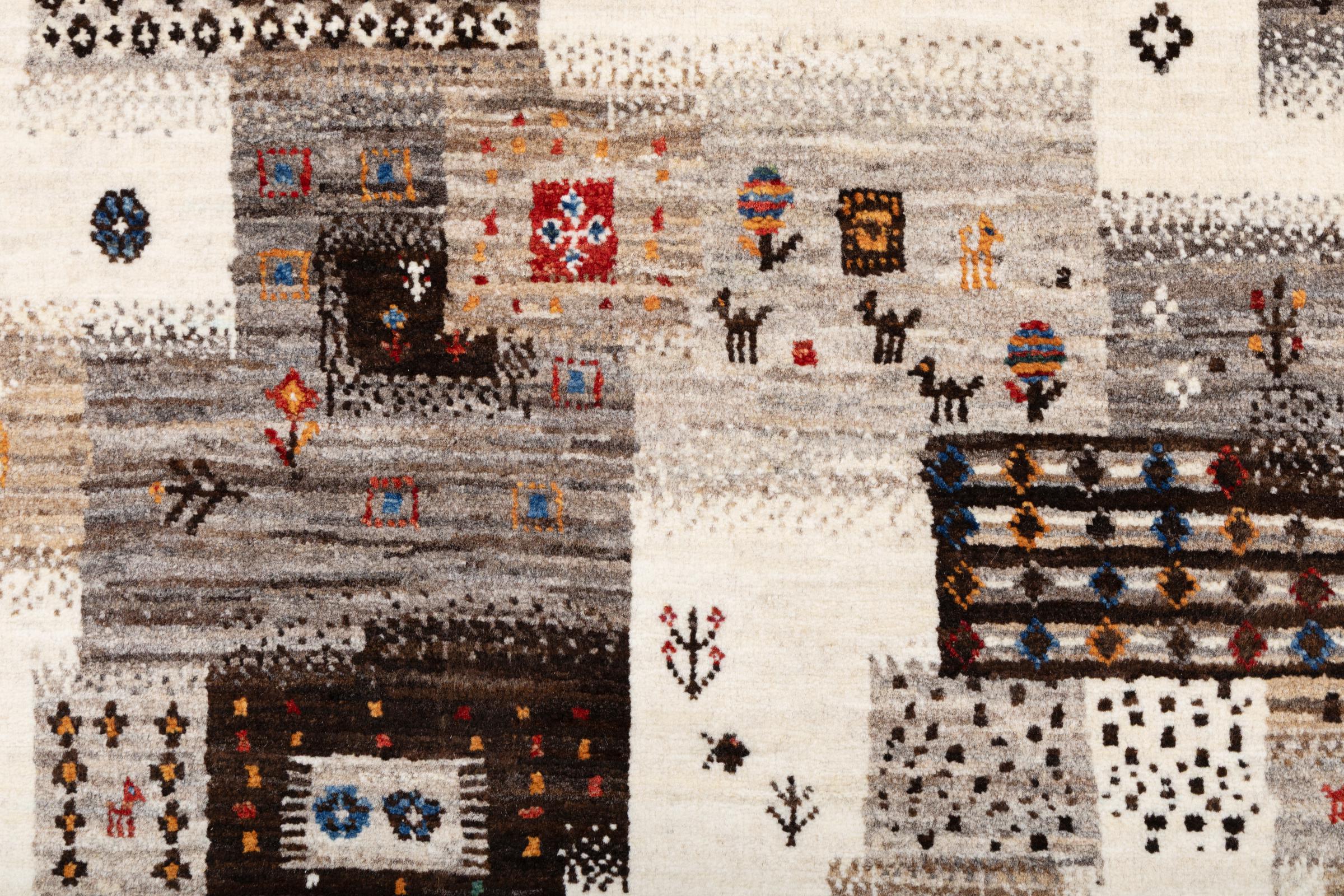 Dit prachtige tapijt is een Perzisch Gabbeh-tapijt en behoort daarom tot de hoogste kwaliteit Gabbeh-tapijten. De tapijten worden geknoopt door nomaden of semi-nomaden in Iran volgens traditioneel vakmanschap. De eenvoudige motieven en patronen zijn vooral geïnspireerd op de directe omgeving van de nomaden. Zo zijn er bijvoorbeeld kamelen, bomen of struiken te vinden op de traditionele tapijten. De Perzische Gabbeh-tapijten zijn gemaakt van wol van lokaal opgefokte kuddes schapen. De wol wordt dus meestal nog met de hand gesponnen. Elk van deze oosterse tapijten belichaamt dus een uniek karakter van de eeuwenoude cultuur.