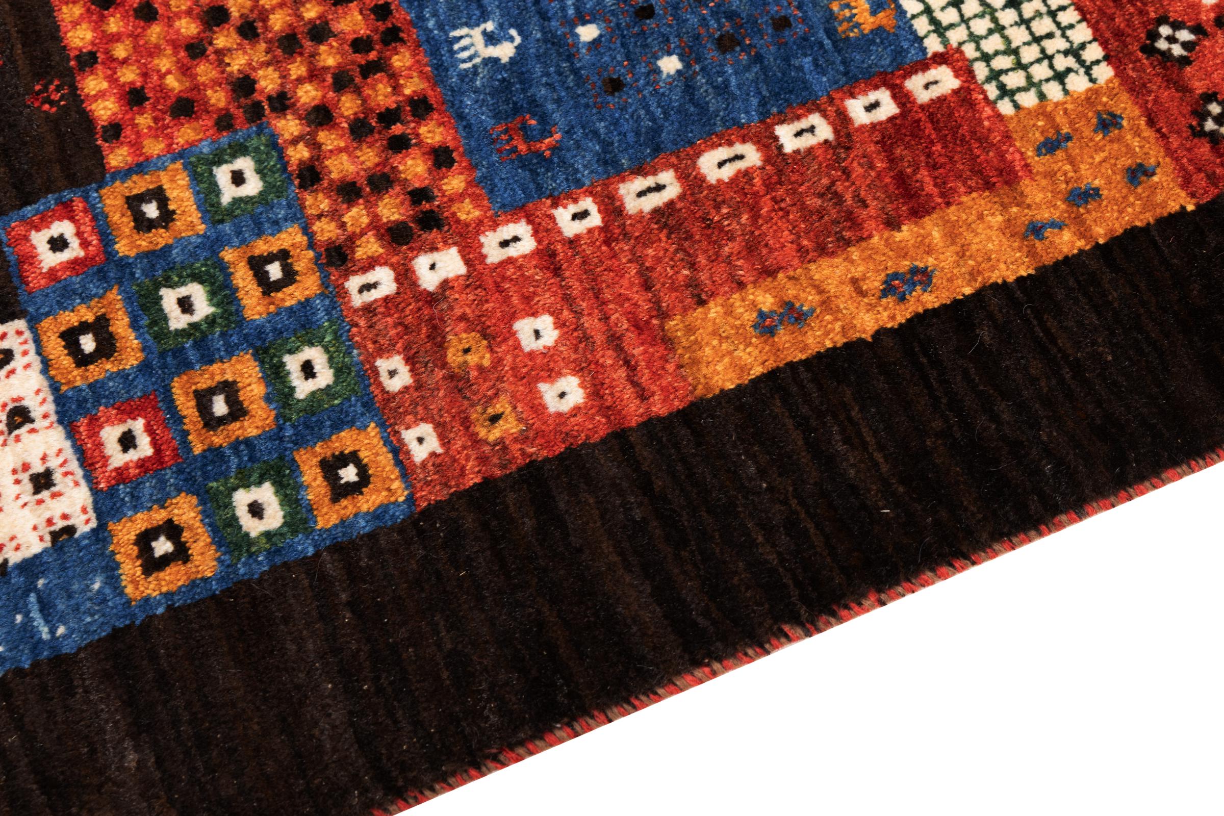 Dit prachtige tapijt is een Perzisch Gabbeh-tapijt en behoort daarom tot de hoogste kwaliteit Gabbeh-tapijten. De tapijten worden geknoopt door nomaden of semi-nomaden in Iran volgens traditioneel vakmanschap. De eenvoudige motieven en patronen zijn vooral geïnspireerd op de directe omgeving van de nomaden. Zo zijn er bijvoorbeeld kamelen, bomen of struiken te vinden op de traditionele tapijten. De Perzische Gabbeh-tapijten zijn gemaakt van wol van lokaal opgefokte kuddes schapen. De wol wordt dus meestal nog met de hand gesponnen. Elk van deze oosterse tapijten belichaamt dus een uniek karakter van de eeuwenoude cultuur.