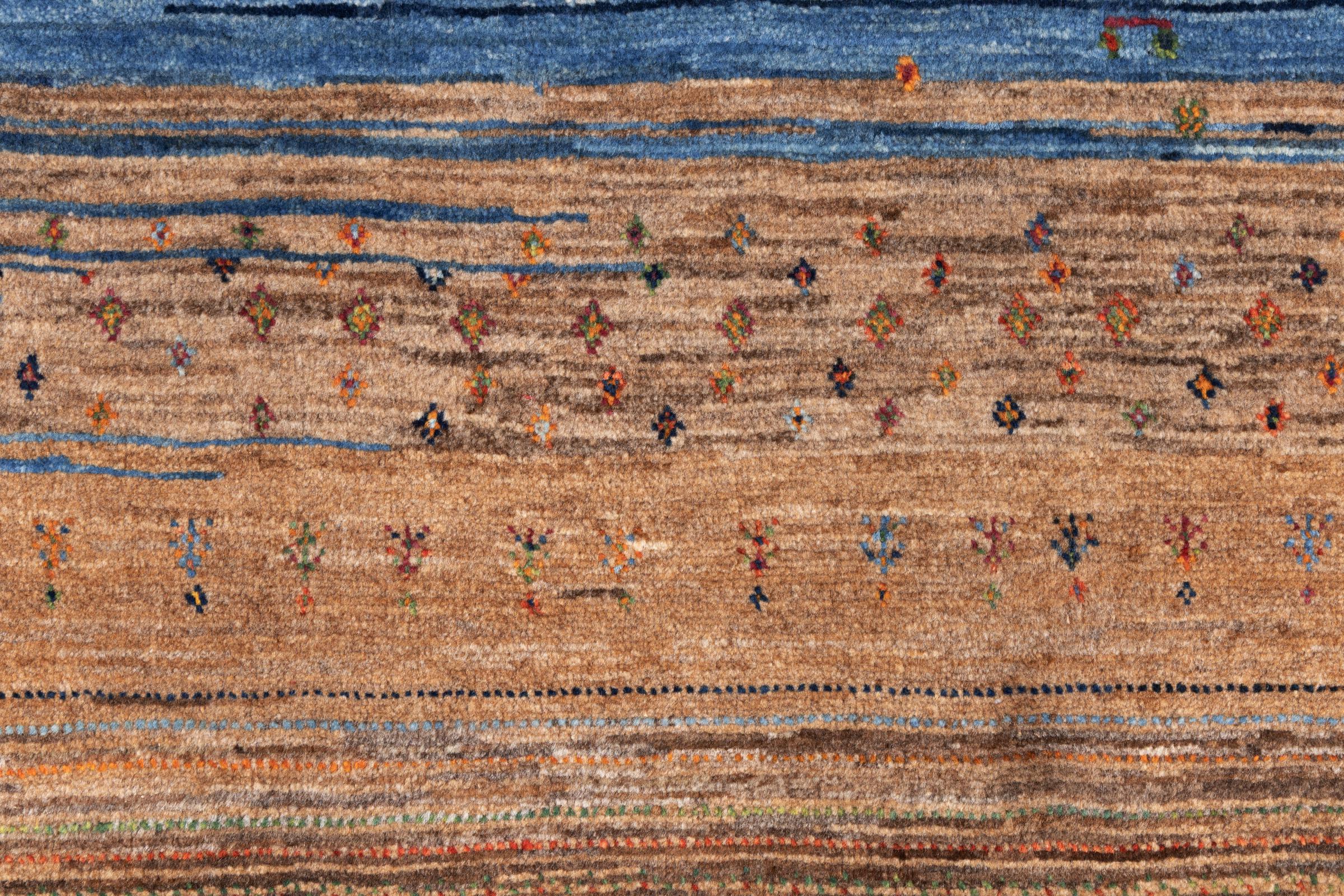 Dit prachtige tapijt is een Perzisch Gabbeh-tapijt en behoort daarom tot de hoogste kwaliteit Gabbeh-tapijten. De tapijten worden geknoopt door nomaden of semi-nomaden in Iran volgens traditioneel vakmanschap. De eenvoudige motieven en patronen zijn vooral geïnspireerd op de directe omgeving van de nomaden. Zo zijn er bijvoorbeeld kamelen, bomen of struiken te vinden op de traditionele tapijten. De Perzische Gabbeh-tapijten zijn gemaakt van wol van lokaal opgefokte kuddes schapen. De wol wordt dus meestal nog met de hand gesponnen. Elk van deze oosterse tapijten belichaamt dus een uniek karakter van de eeuwenoude cultuur.