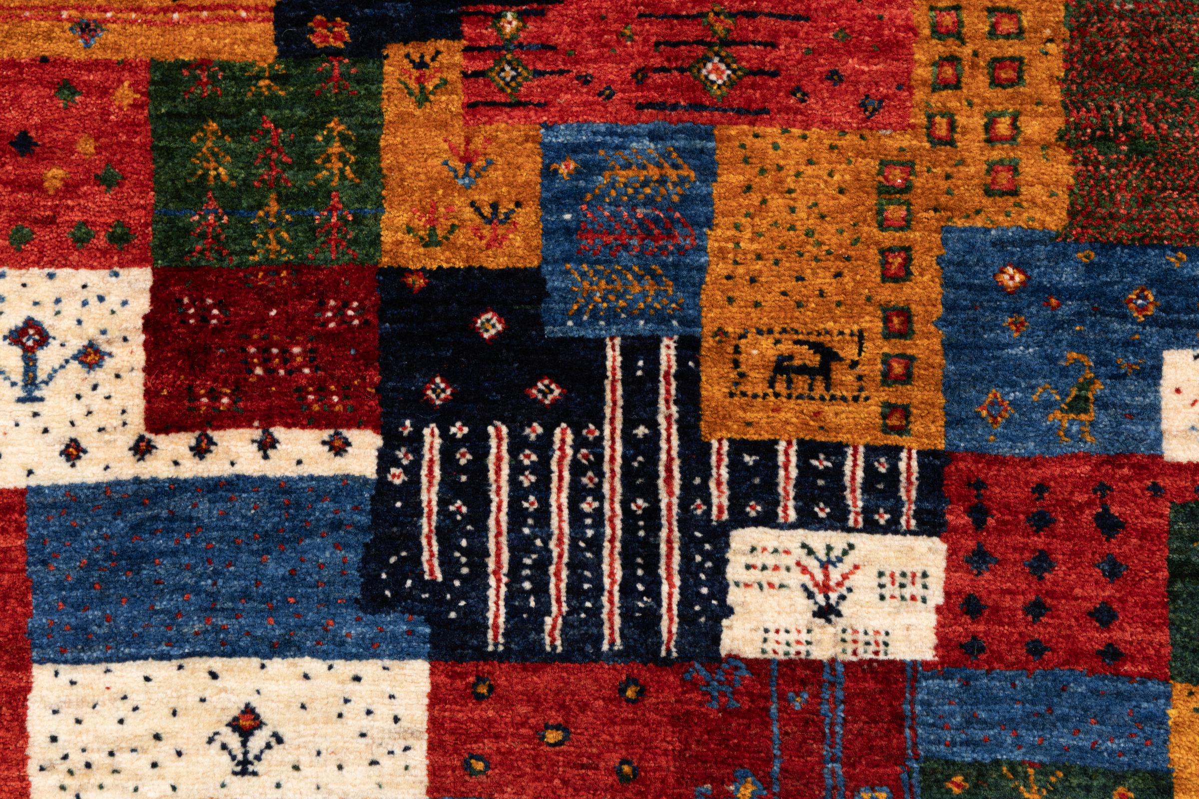 Een verfijning van de al bekende Gabbeh-tapijten: Dit is deze Perzische Gabbeh Loribaft. Het weet indruk te maken met zijn fijnere weefsel en prachtige ontwerp. Het werd door Loren in het zuiden van Perzië met de hand geknoopt van de beste handgesponnen schapenwol. Voor het verven van de wol worden uitsluitend pure plantaardige kleurstoffen gebruikt. Met dit vloerkleed haal je de hoogste standaard van een Gabbeh-tapijt in huis.