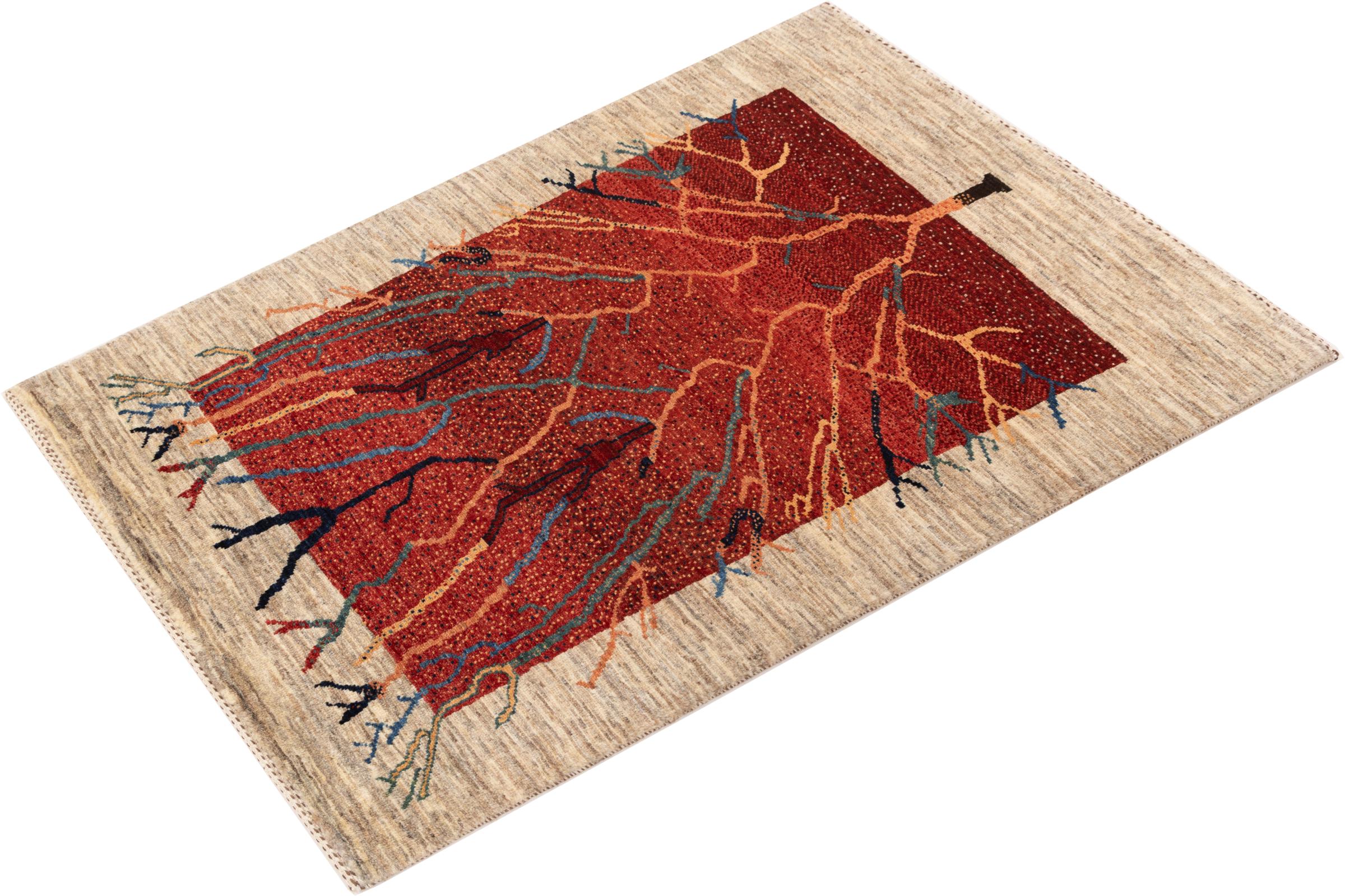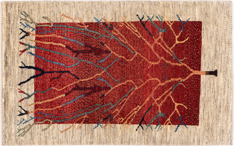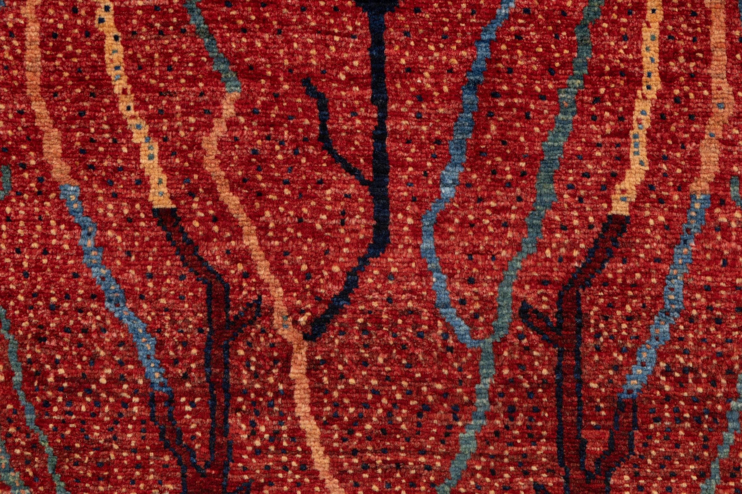 Dit prachtige tapijt is een Perzisch Gabbeh-tapijt en behoort daarom tot de hoogste kwaliteit Gabbeh-tapijten. De tapijten worden geknoopt door nomaden of semi-nomaden in Iran volgens traditioneel vakmanschap. De eenvoudige motieven en patronen zijn vooral geïnspireerd op de directe omgeving van de nomaden. Zo zijn er bijvoorbeeld kamelen, bomen of struiken te vinden op de traditionele tapijten. De Perzische Gabbeh-tapijten zijn gemaakt van wol van lokaal opgefokte kuddes schapen. De wol wordt dus meestal nog met de hand gesponnen. Elk van deze oosterse tapijten belichaamt dus een uniek karakter van de eeuwenoude cultuur.
