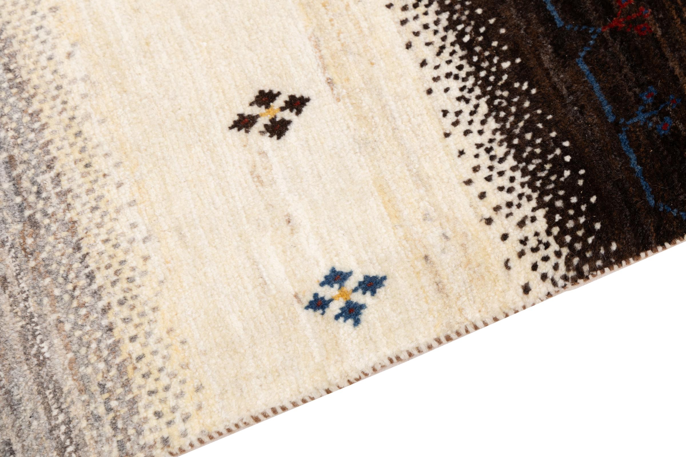 Dit prachtige tapijt is een Perzisch Gabbeh-tapijt en behoort daarom tot de hoogste kwaliteit Gabbeh-tapijten. De tapijten worden geknoopt door nomaden of semi-nomaden in Iran volgens traditioneel vakmanschap. De eenvoudige motieven en patronen zijn vooral geïnspireerd op de directe omgeving van de nomaden. Zo zijn er bijvoorbeeld kamelen, bomen of struiken te vinden op de traditionele tapijten. De Perzische Gabbeh-tapijten zijn gemaakt van wol van lokaal opgefokte kuddes schapen. De wol wordt dus meestal nog met de hand gesponnen. Elk van deze oosterse tapijten belichaamt dus een uniek karakter van de eeuwenoude cultuur.