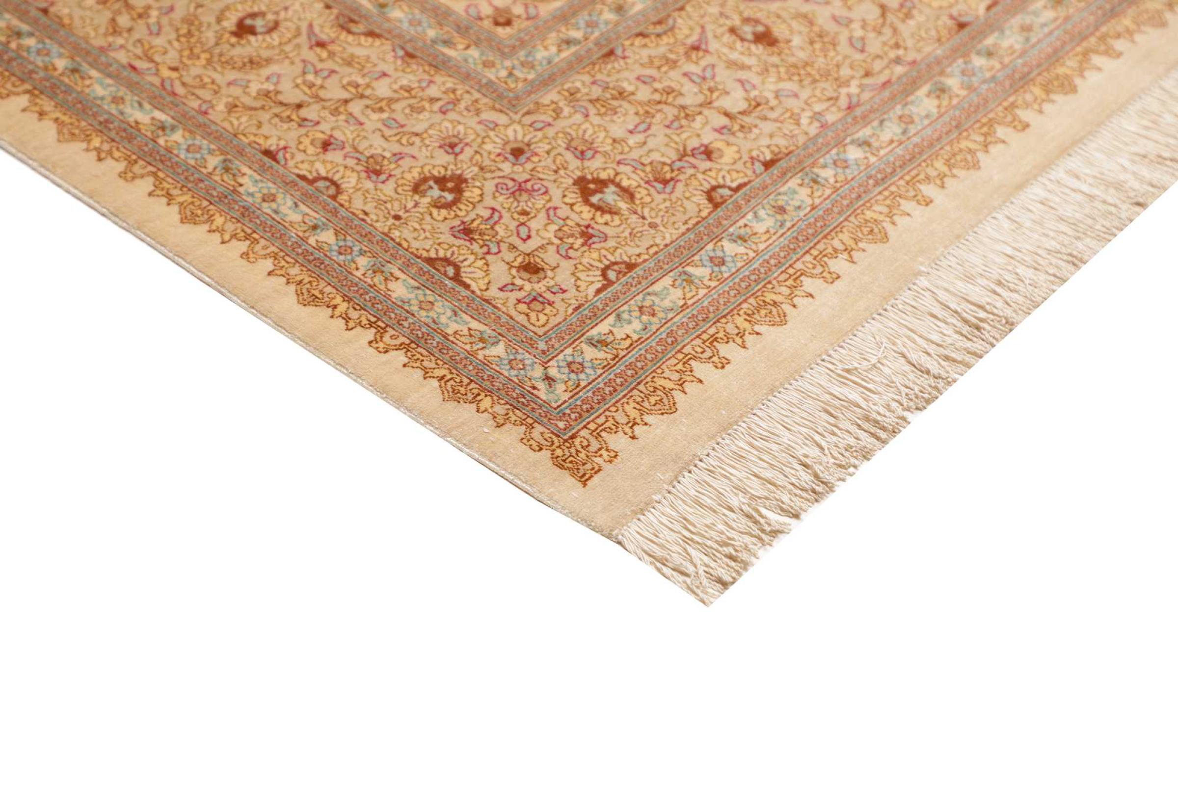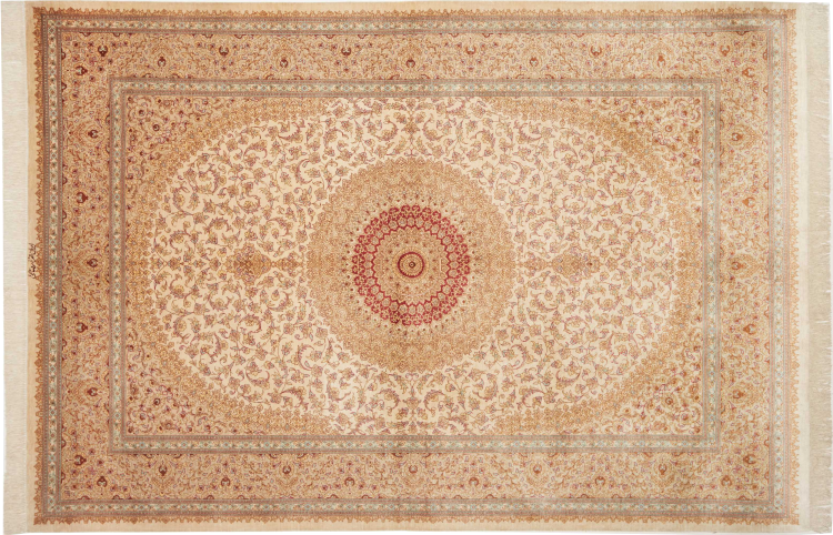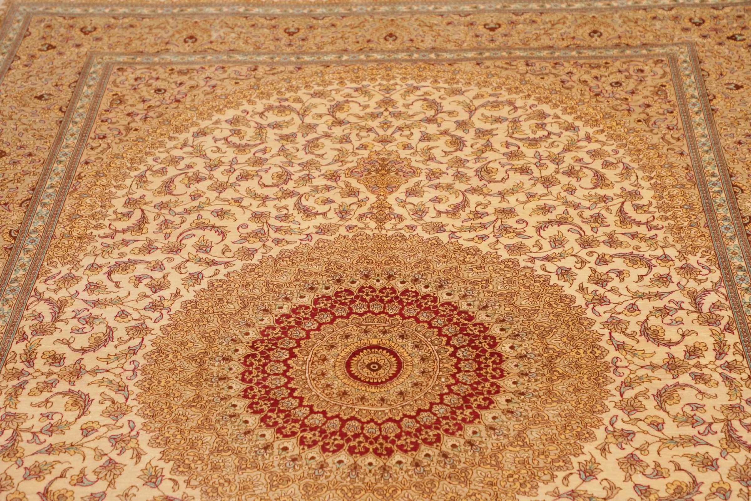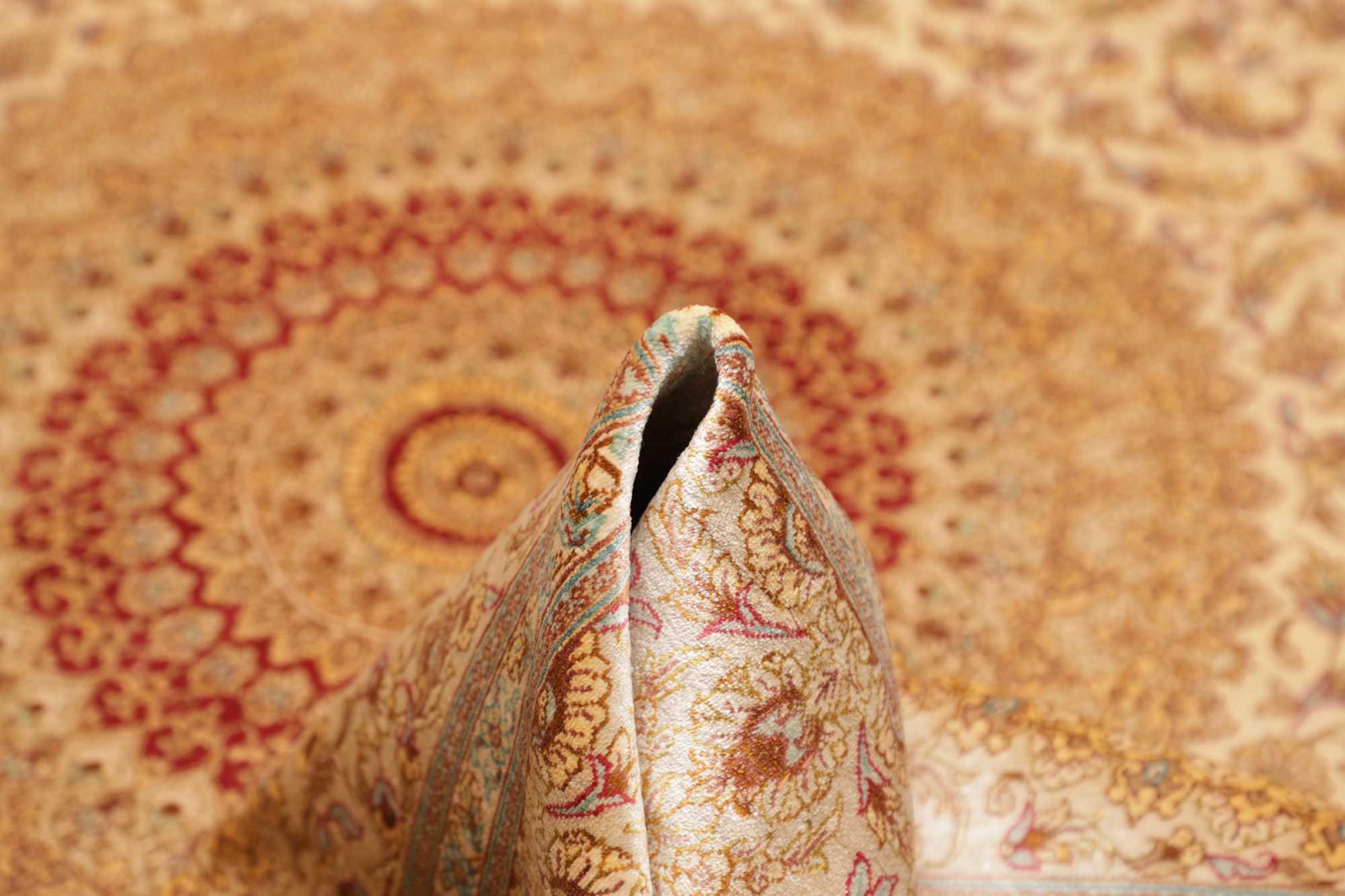 Dit Ghom zijden vloerkleed is pure luxe. De ornamenten en de pure natuurlijke zijde spreken boekdelen. Hier vind je de Oriënt in zijn volle perfectie voor bij jou thuis. Een zijden tapijt van Ghom maakt zelfs indruk op verzamelaars van Perzische tapijtkunst. Afhankelijk van de lichtinval laat de zijde kleuren schitteren in de meest uiteenlopende facetten. Dit maakt dit Perzische tapijt tot een onvergetelijk hoogtepunt en laat je kamer stralen in een gezellige en zeer hoogwaardige sfeer.