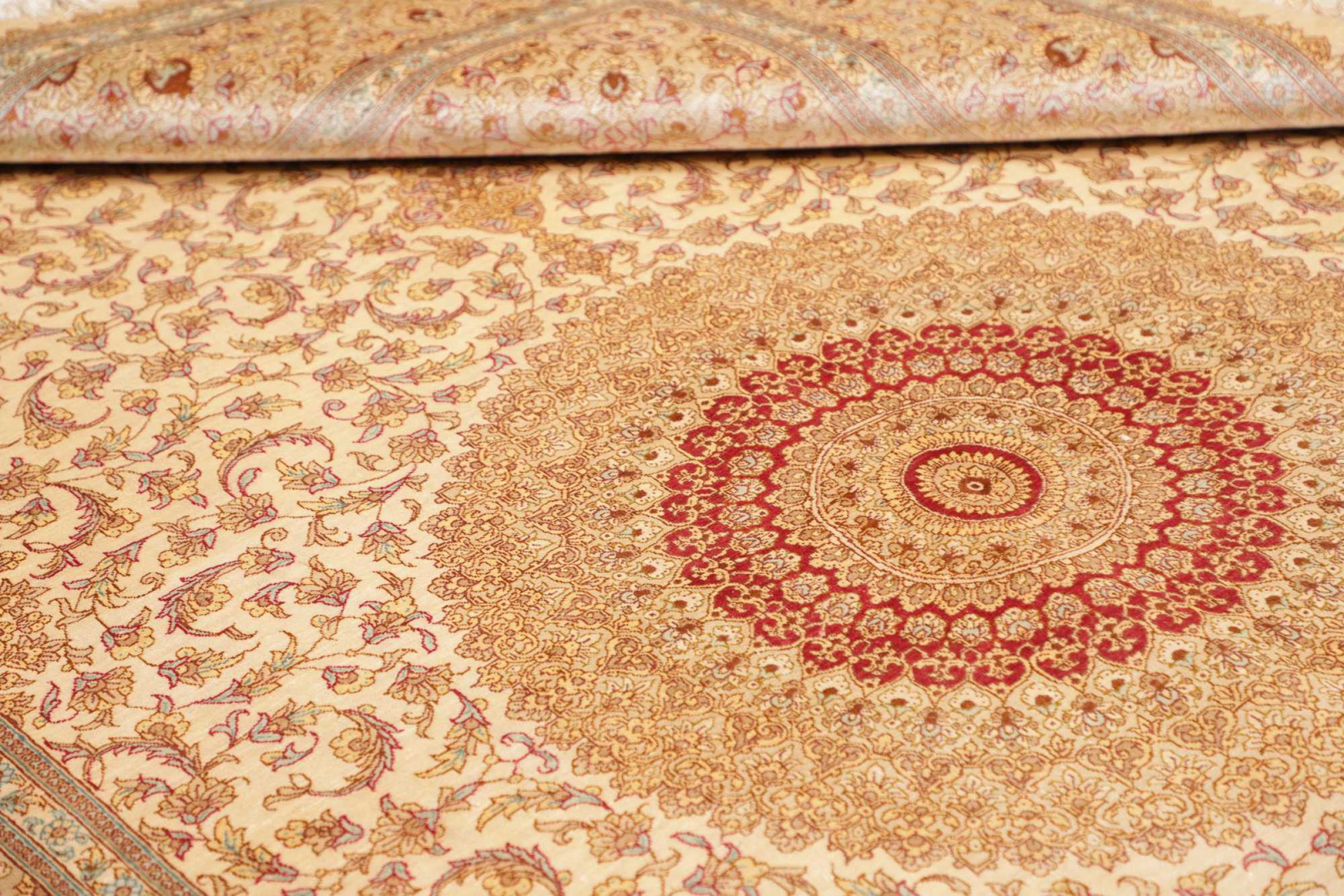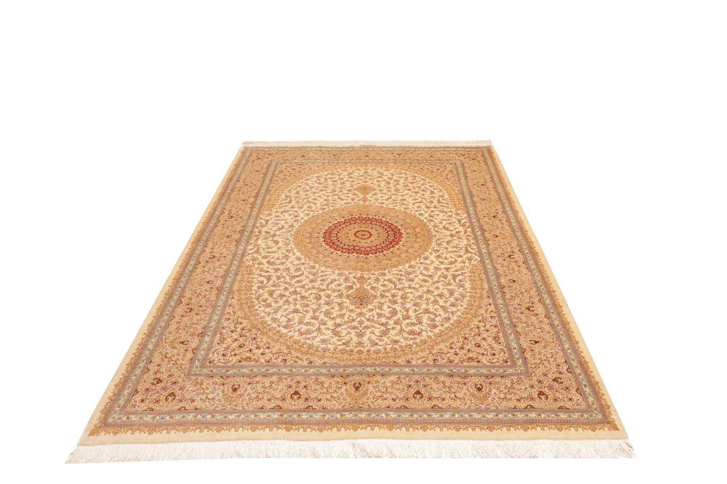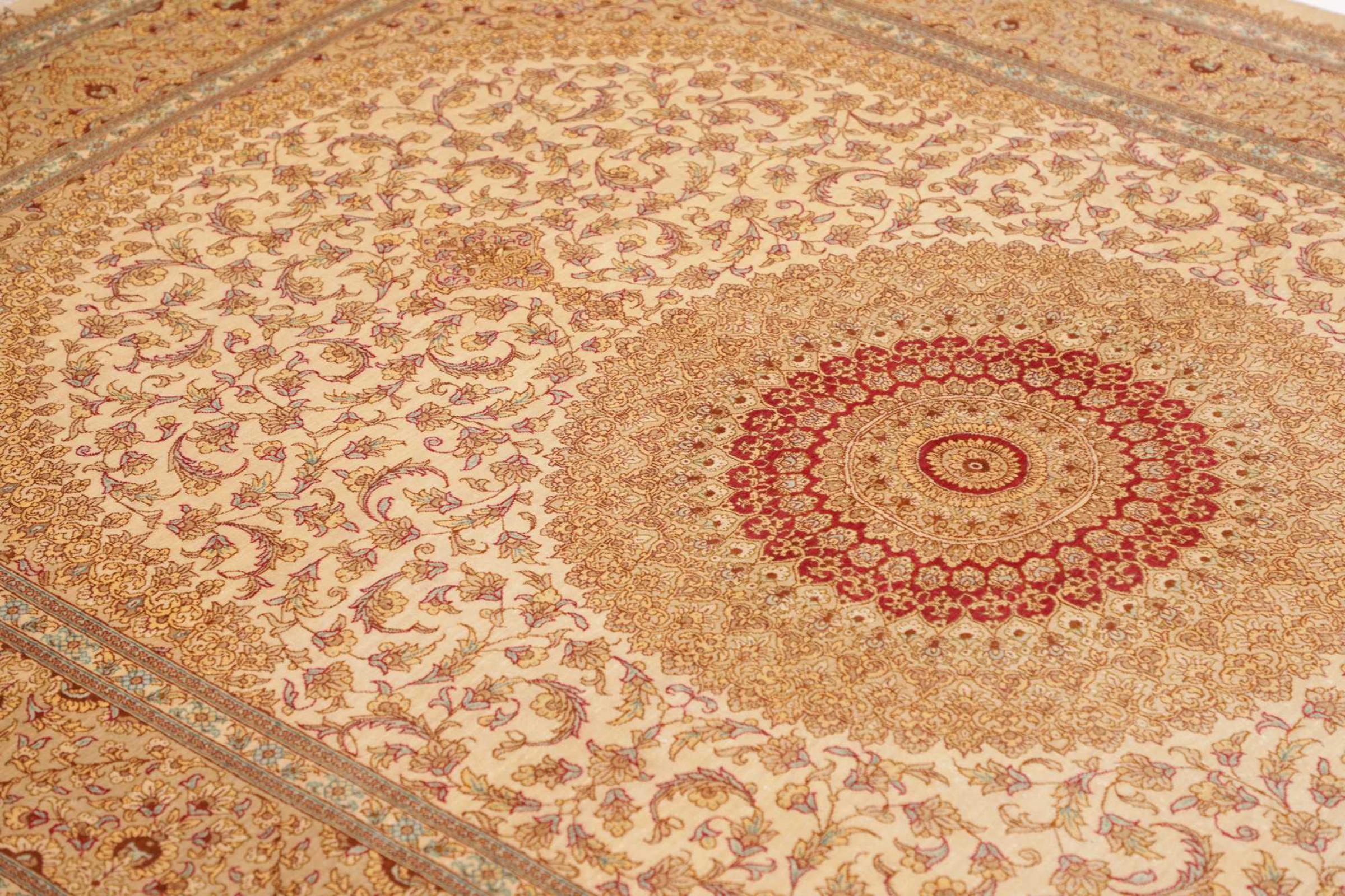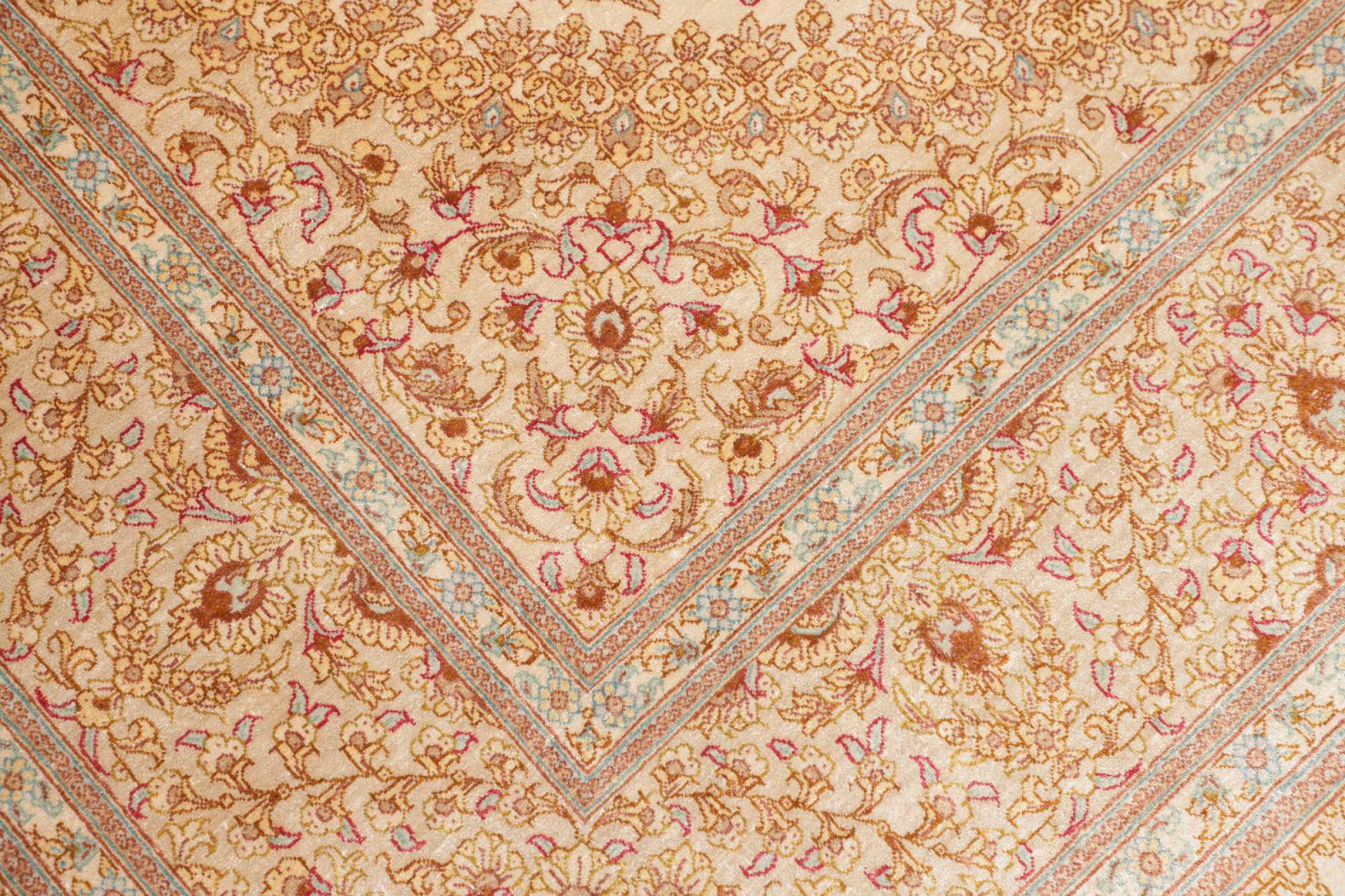 Dit Ghom zijden vloerkleed is pure luxe. De ornamenten en de pure natuurlijke zijde spreken boekdelen. Hier vind je de Oriënt in zijn volle perfectie voor bij jou thuis. Een zijden tapijt van Ghom maakt zelfs indruk op verzamelaars van Perzische tapijtkunst. Afhankelijk van de lichtinval laat de zijde kleuren schitteren in de meest uiteenlopende facetten. Dit maakt dit Perzische tapijt tot een onvergetelijk hoogtepunt en laat je kamer stralen in een gezellige en zeer hoogwaardige sfeer.