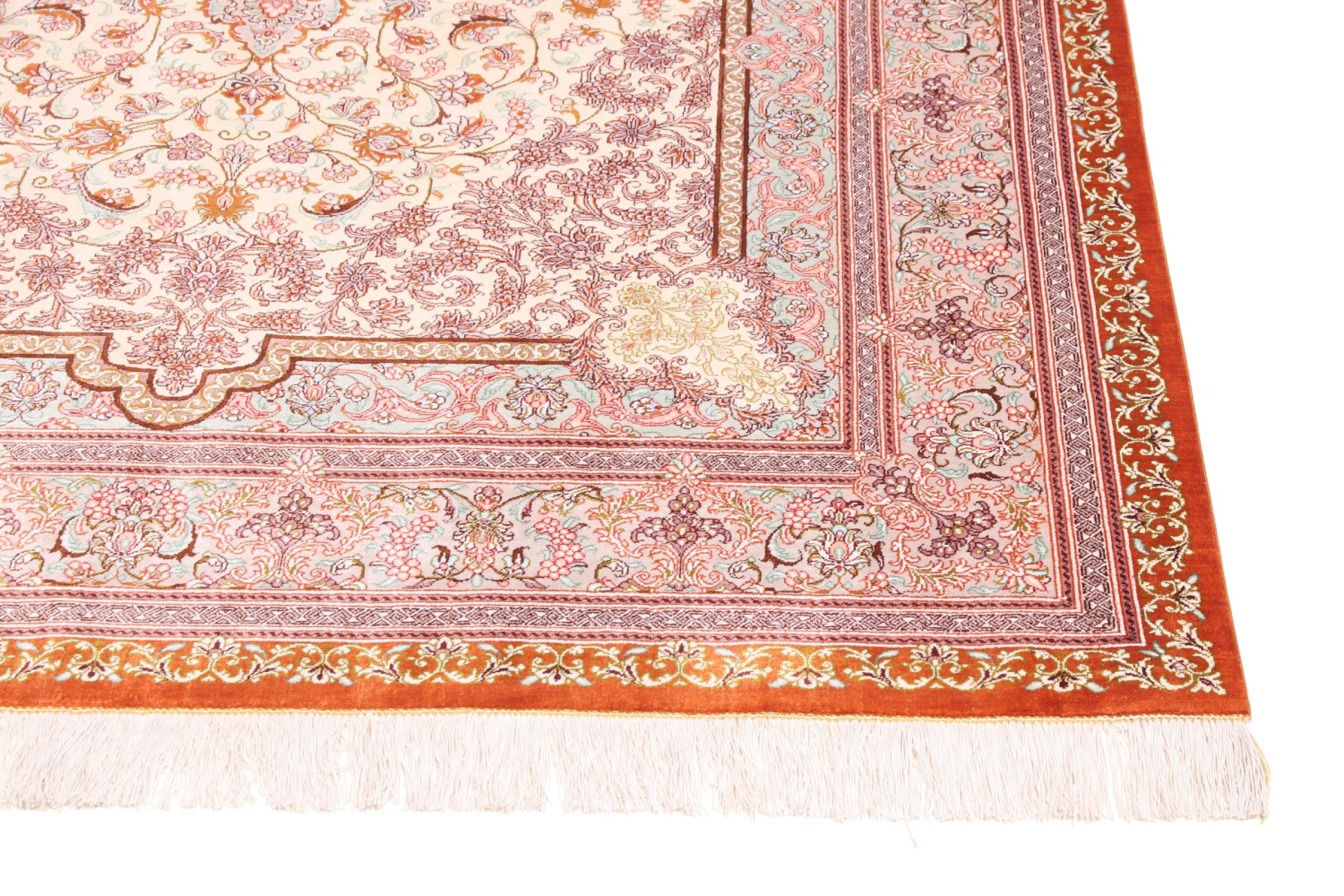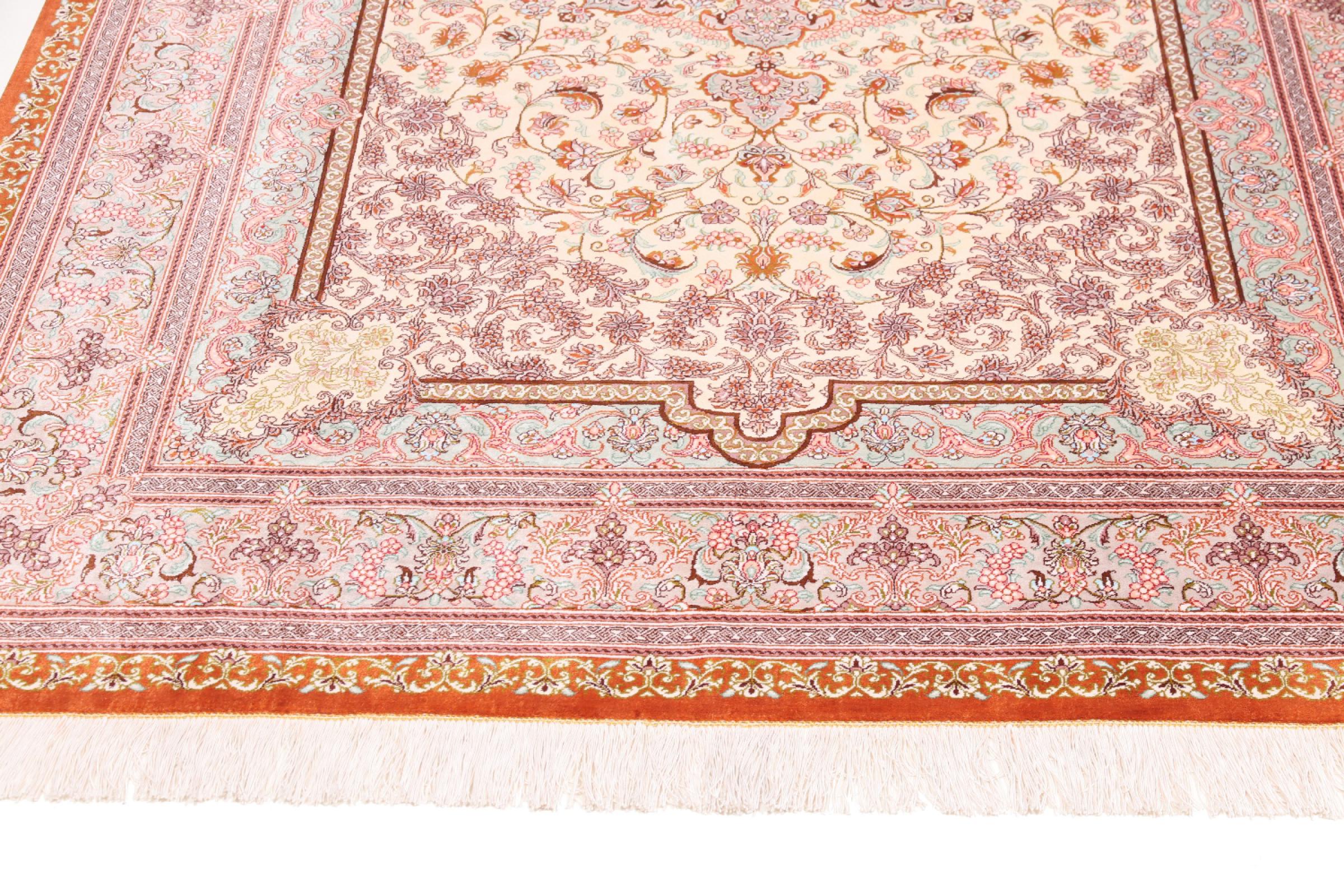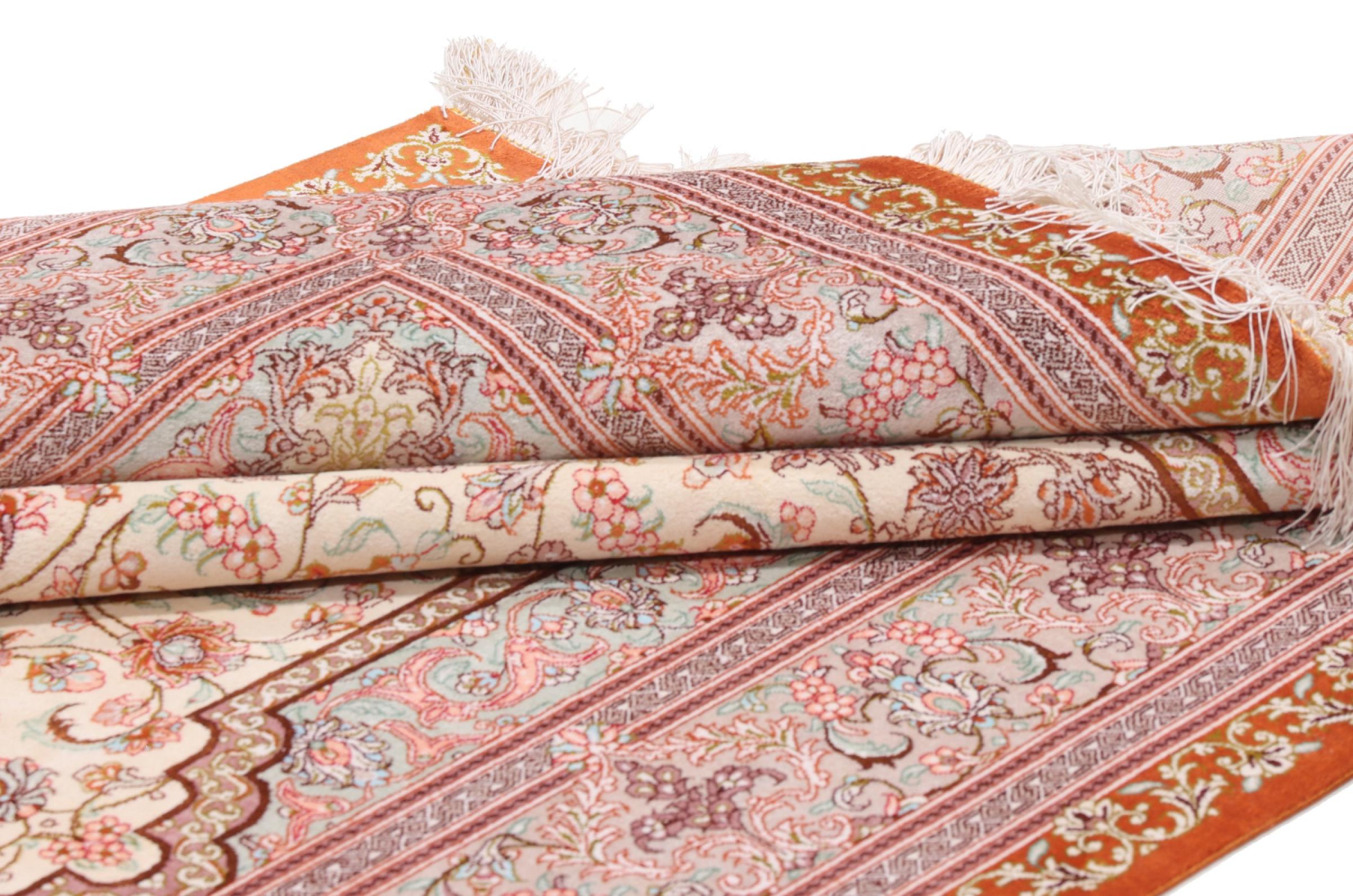 Dit Ghom zijden vloerkleed is pure luxe. De ornamenten en de pure natuurlijke zijde spreken boekdelen. Hier vind je de Oriënt in zijn volle perfectie voor bij jou thuis. Een zijden tapijt van Ghom maakt zelfs indruk op verzamelaars van Perzische tapijtkunst. Afhankelijk van de lichtinval laat de zijde kleuren schitteren in de meest uiteenlopende facetten. Dit maakt dit Perzische tapijt tot een onvergetelijk hoogtepunt en laat je kamer stralen in een gezellige en zeer hoogwaardige sfeer.