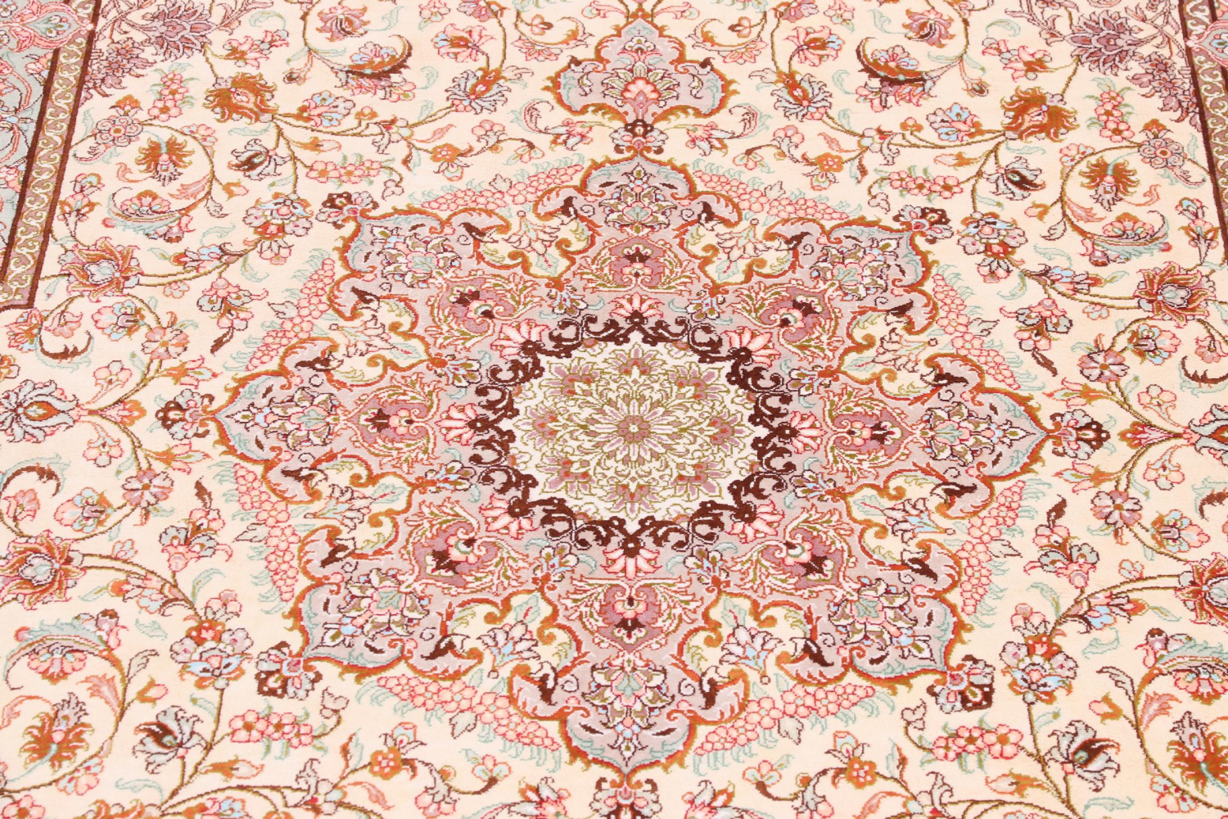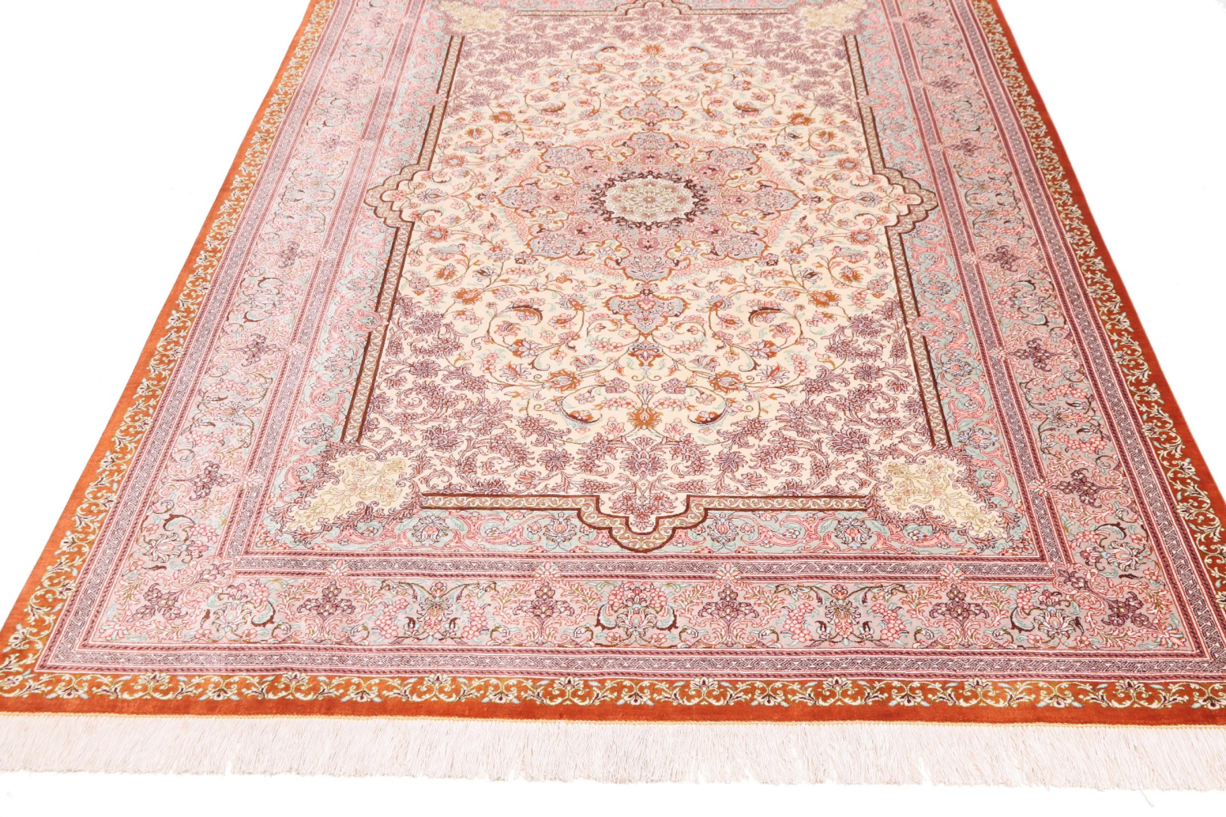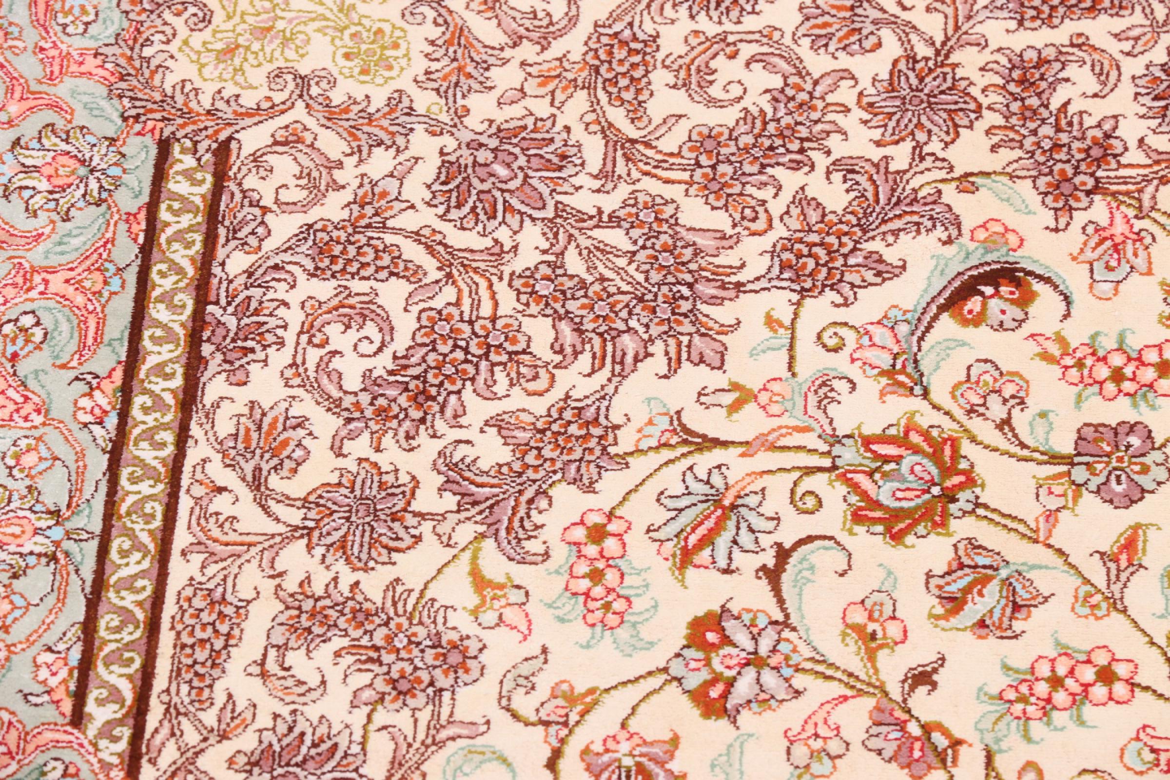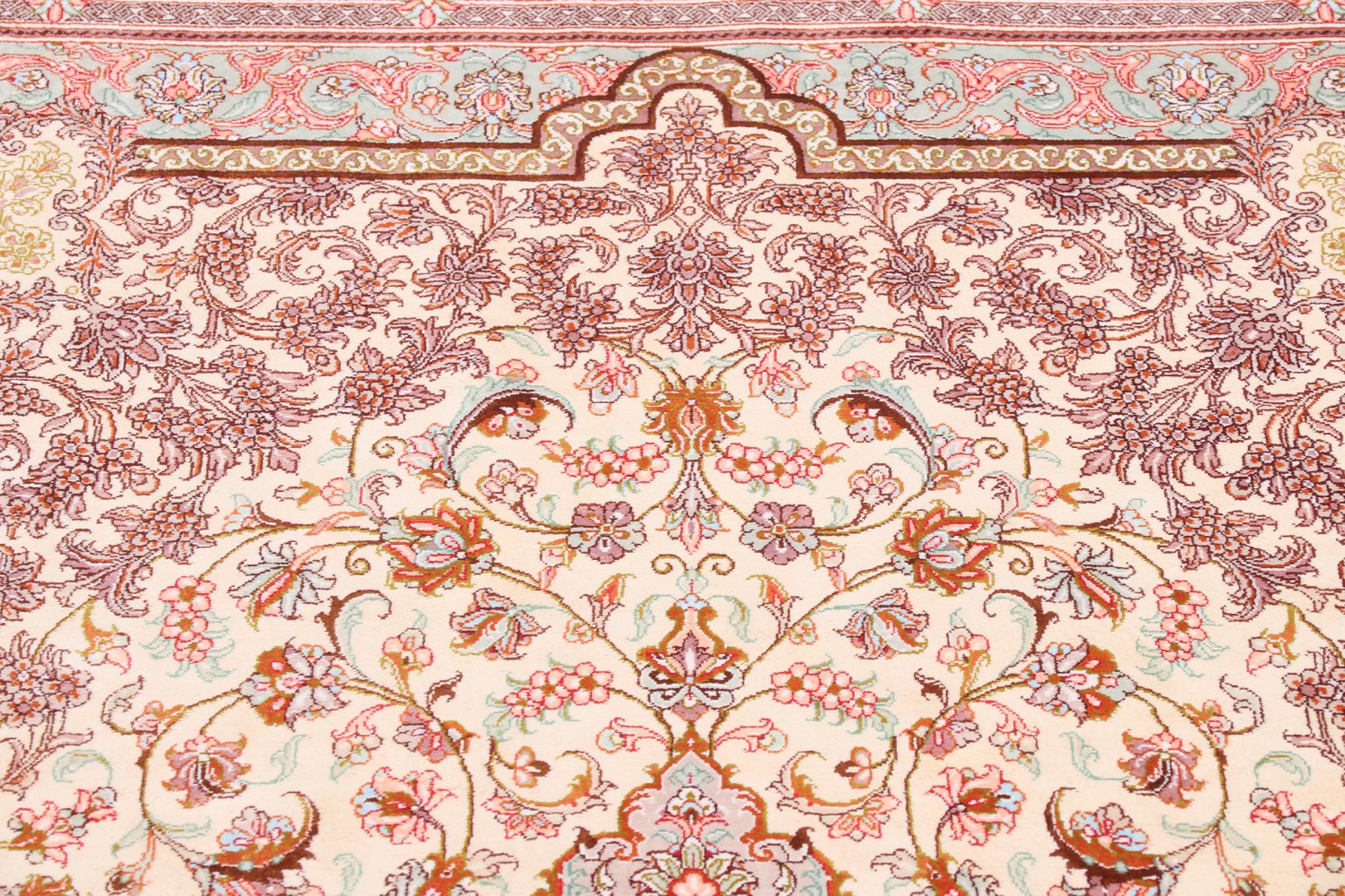 Dit Ghom zijden vloerkleed is pure luxe. De ornamenten en de pure natuurlijke zijde spreken boekdelen. Hier vind je de Oriënt in zijn volle perfectie voor bij jou thuis. Een zijden tapijt van Ghom maakt zelfs indruk op verzamelaars van Perzische tapijtkunst. Afhankelijk van de lichtinval laat de zijde kleuren schitteren in de meest uiteenlopende facetten. Dit maakt dit Perzische tapijt tot een onvergetelijk hoogtepunt en laat je kamer stralen in een gezellige en zeer hoogwaardige sfeer.