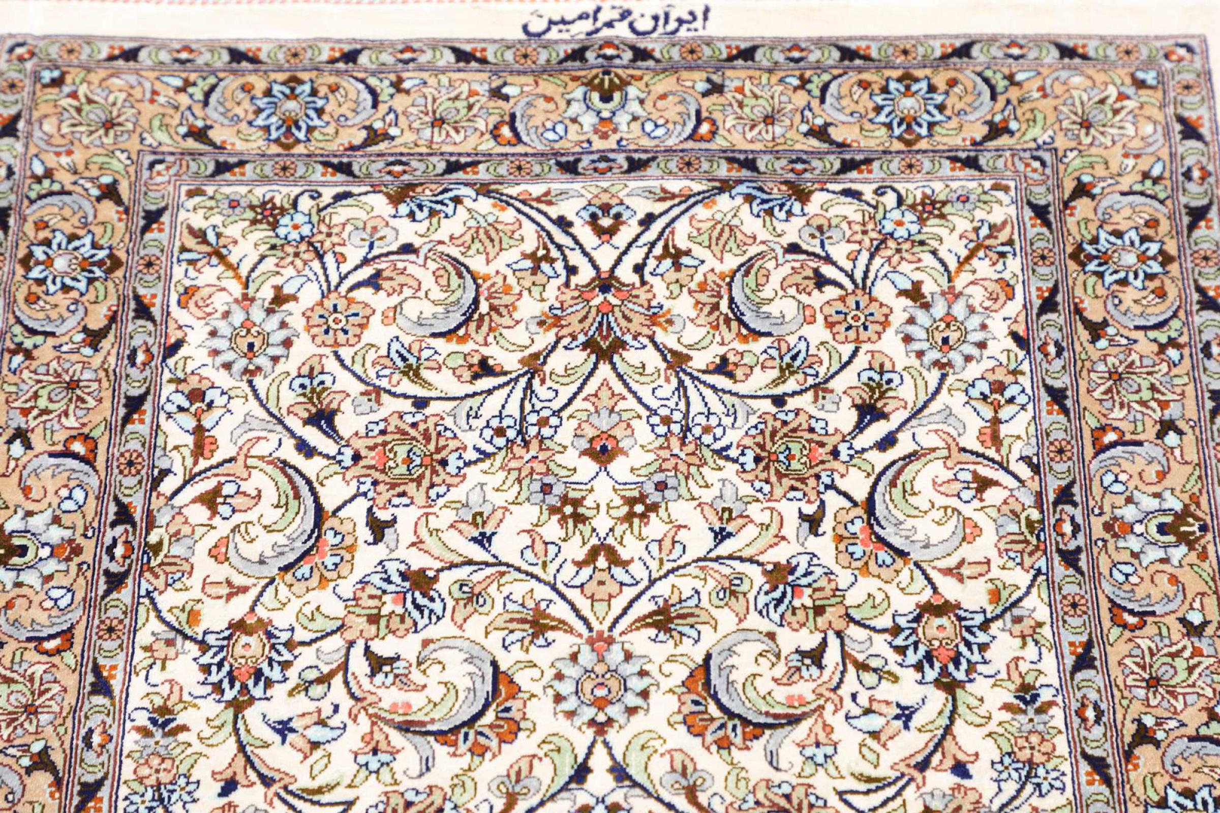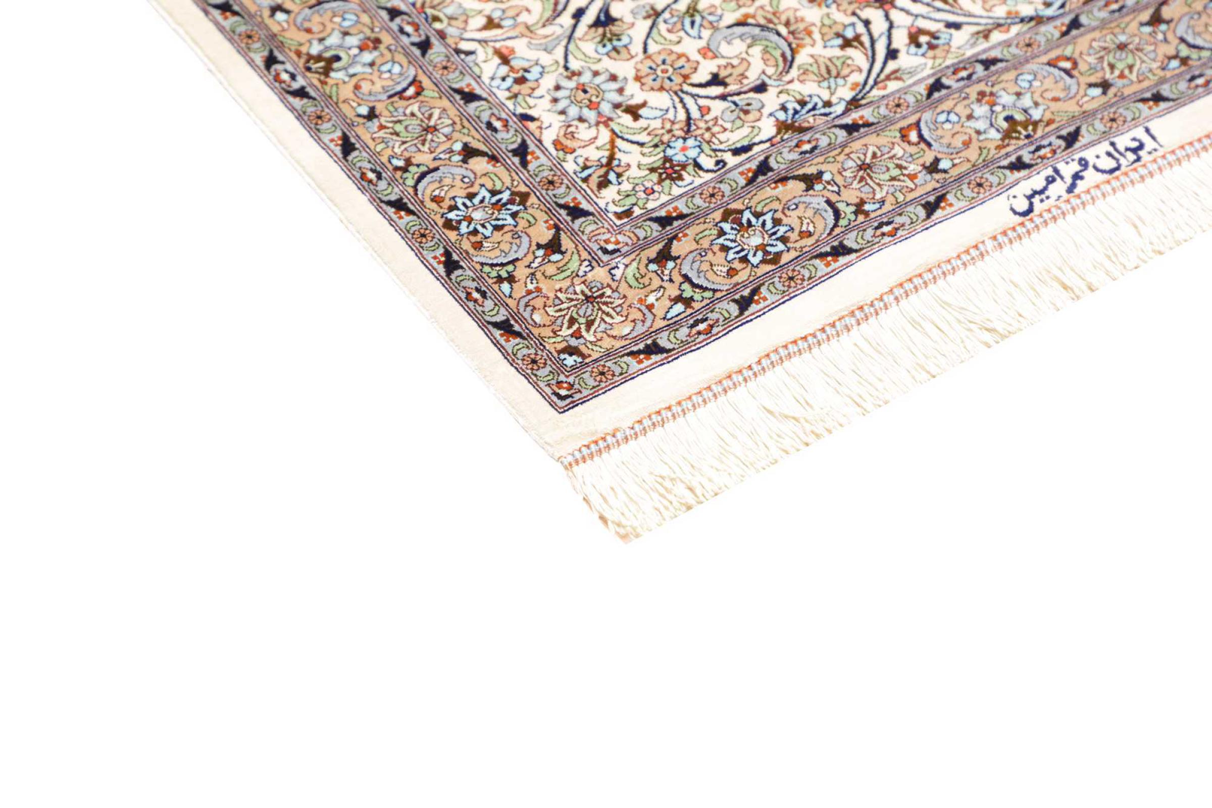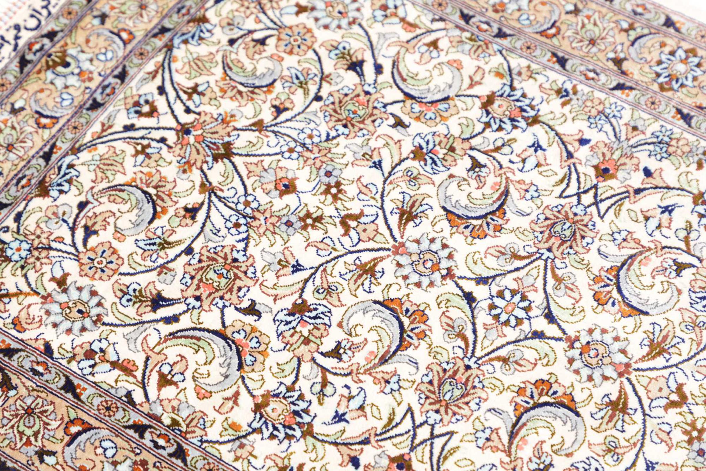 Dit Ghom zijden vloerkleed is pure luxe. De ornamenten en de pure natuurlijke zijde spreken boekdelen. Hier vind je de Oriënt in zijn volle perfectie voor bij jou thuis. Een zijden tapijt van Ghom maakt zelfs indruk op verzamelaars van Perzische tapijtkunst. Afhankelijk van de lichtinval laat de zijde kleuren schitteren in de meest uiteenlopende facetten. Dit maakt dit Perzische tapijt tot een onvergetelijk hoogtepunt en laat je kamer stralen in een gezellige en zeer hoogwaardige sfeer.