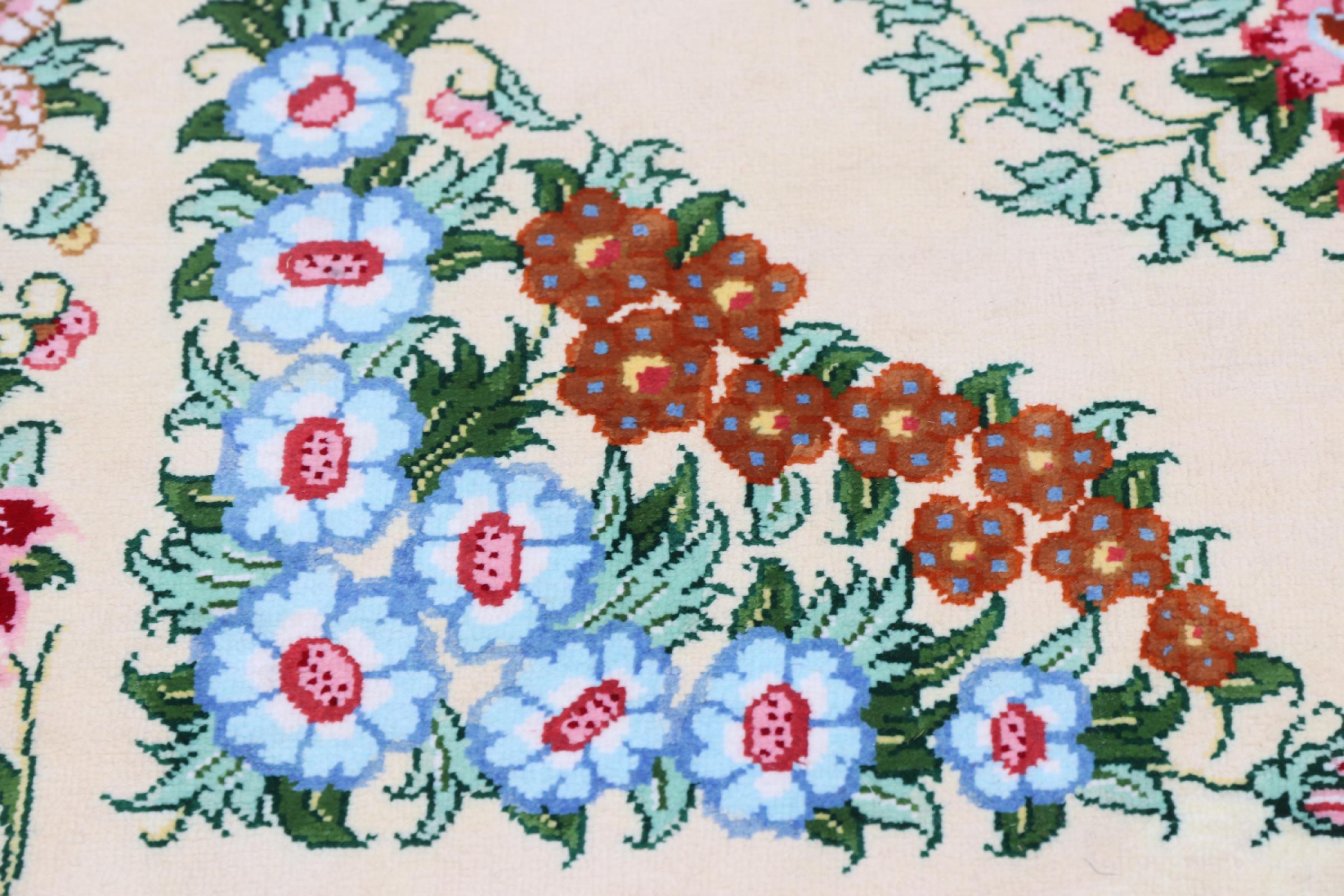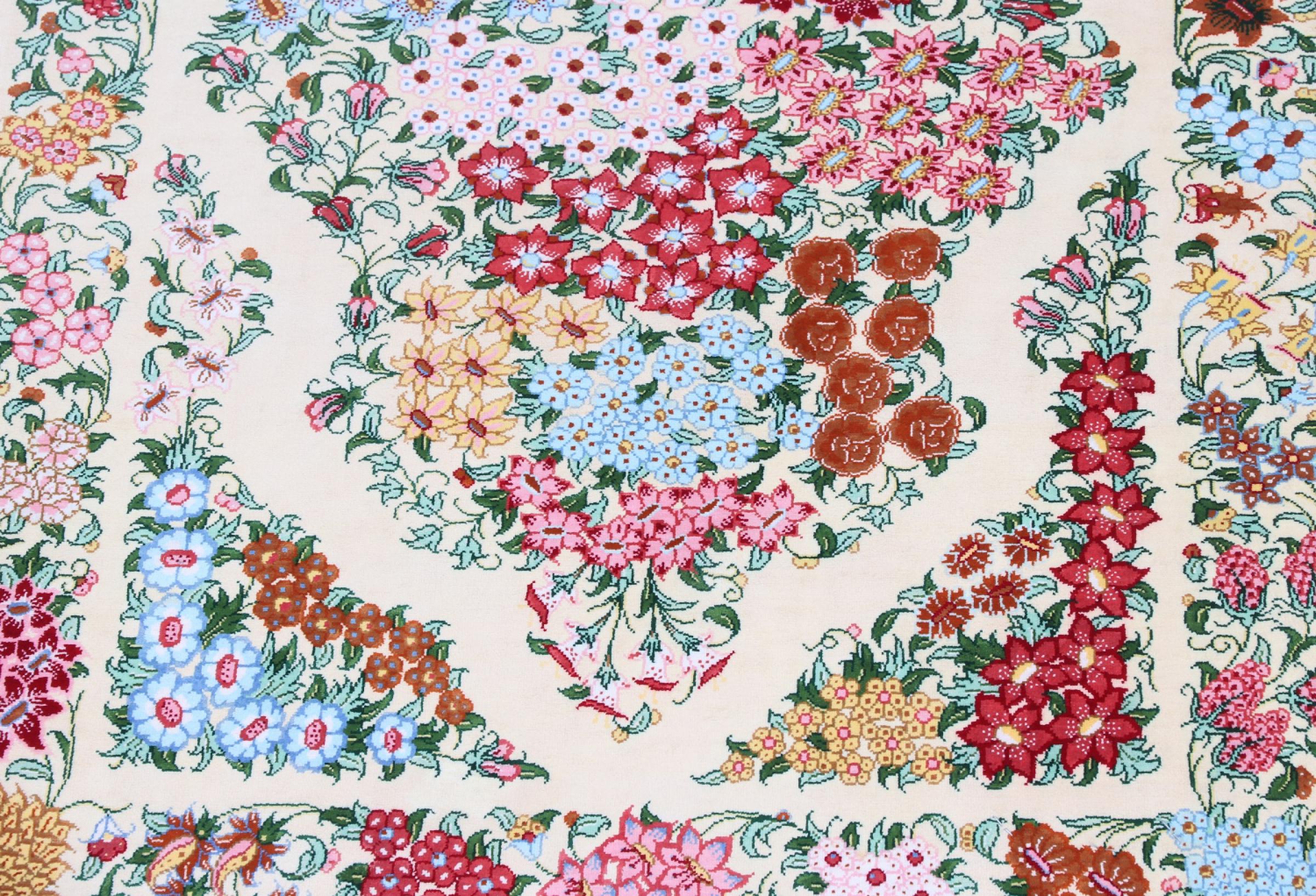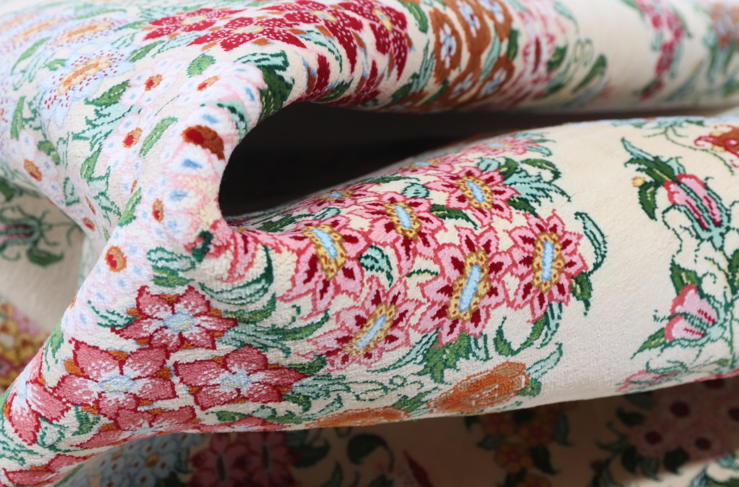 Dit Ghom zijden vloerkleed is pure luxe. De ornamenten en de pure natuurlijke zijde spreken boekdelen. Hier vind je de Oriënt in zijn volle perfectie voor bij jou thuis. Een zijden tapijt van Ghom maakt zelfs indruk op verzamelaars van Perzische tapijtkunst. Afhankelijk van de lichtinval laat de zijde kleuren schitteren in de meest uiteenlopende facetten. Dit maakt dit Perzische tapijt tot een onvergetelijk hoogtepunt en laat je kamer stralen in een gezellige en zeer hoogwaardige sfeer.