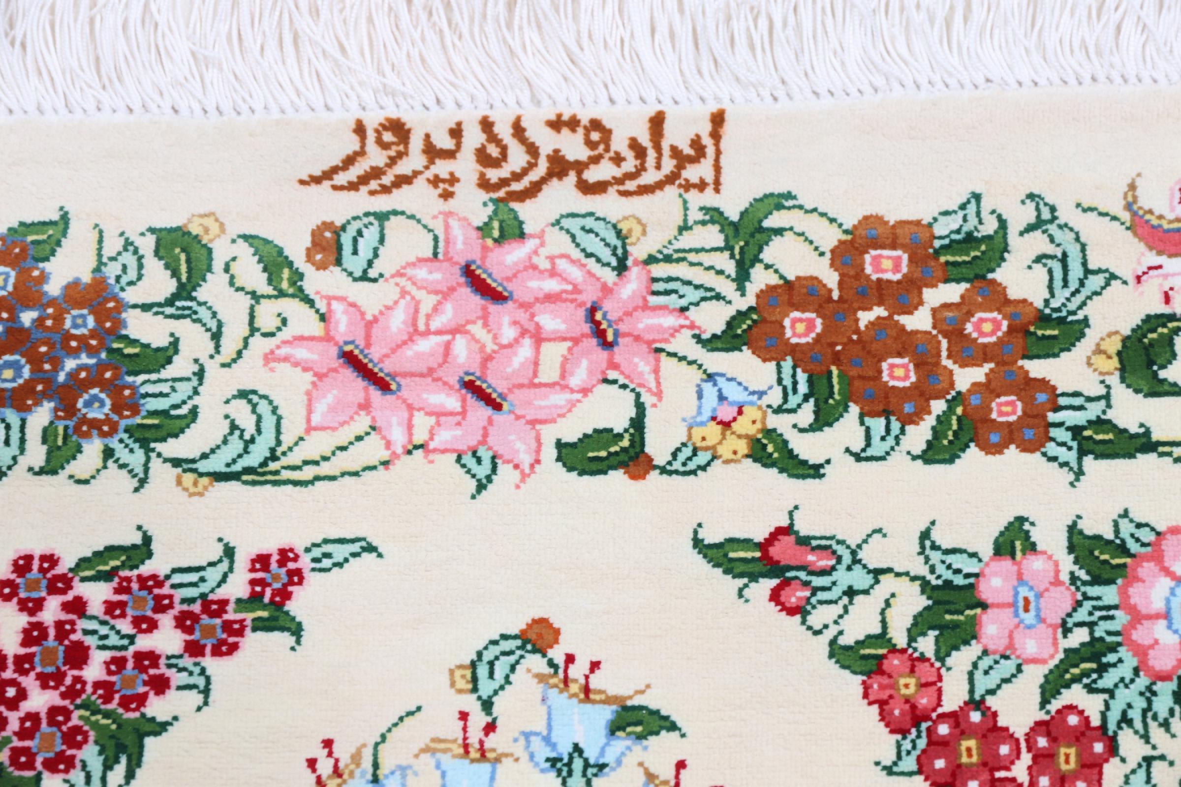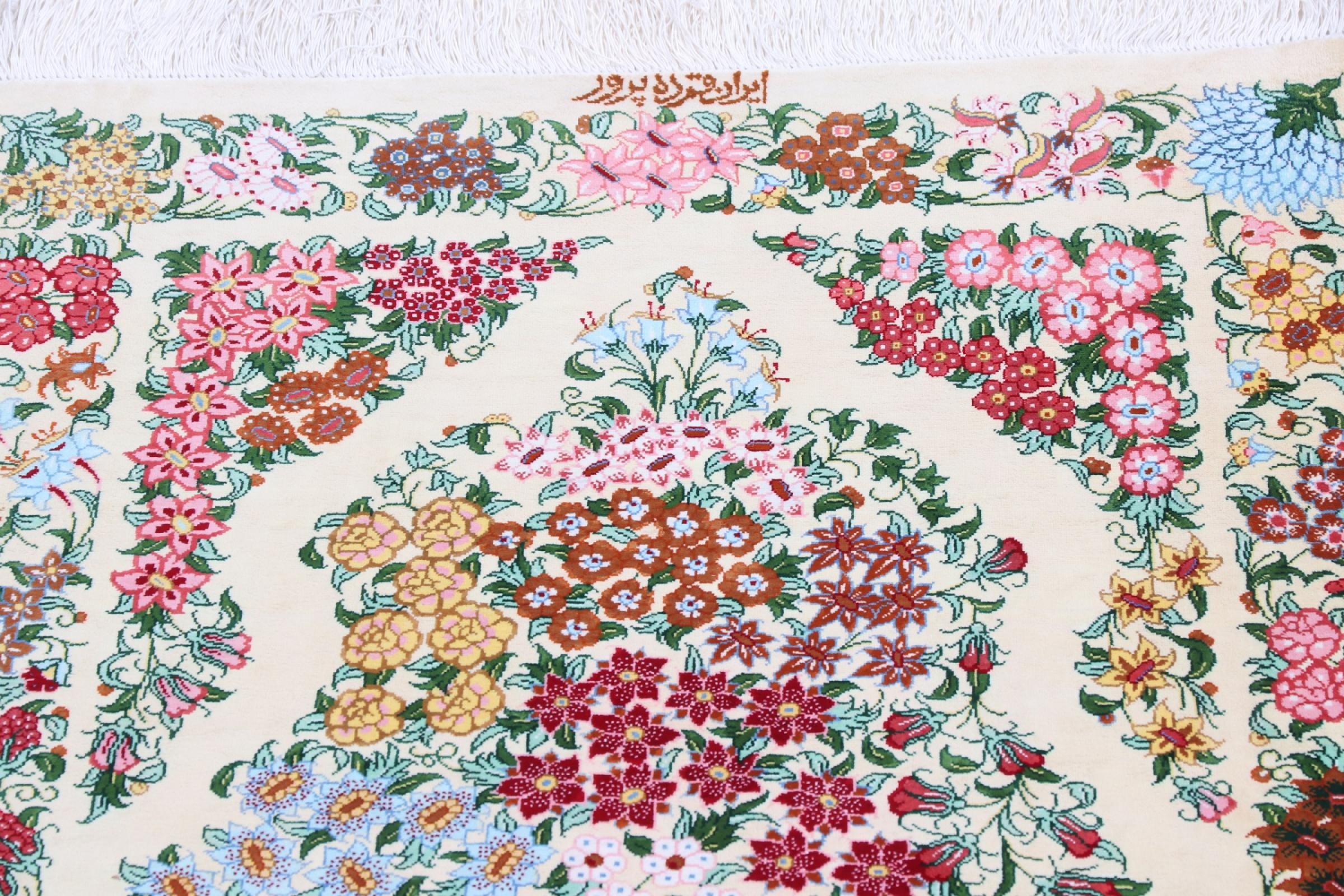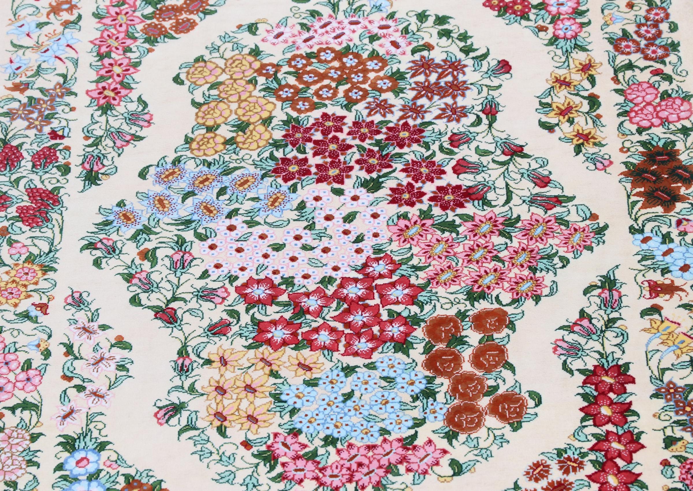 Dit Ghom zijden vloerkleed is pure luxe. De ornamenten en de pure natuurlijke zijde spreken boekdelen. Hier vind je de Oriënt in zijn volle perfectie voor bij jou thuis. Een zijden tapijt van Ghom maakt zelfs indruk op verzamelaars van Perzische tapijtkunst. Afhankelijk van de lichtinval laat de zijde kleuren schitteren in de meest uiteenlopende facetten. Dit maakt dit Perzische tapijt tot een onvergetelijk hoogtepunt en laat je kamer stralen in een gezellige en zeer hoogwaardige sfeer.